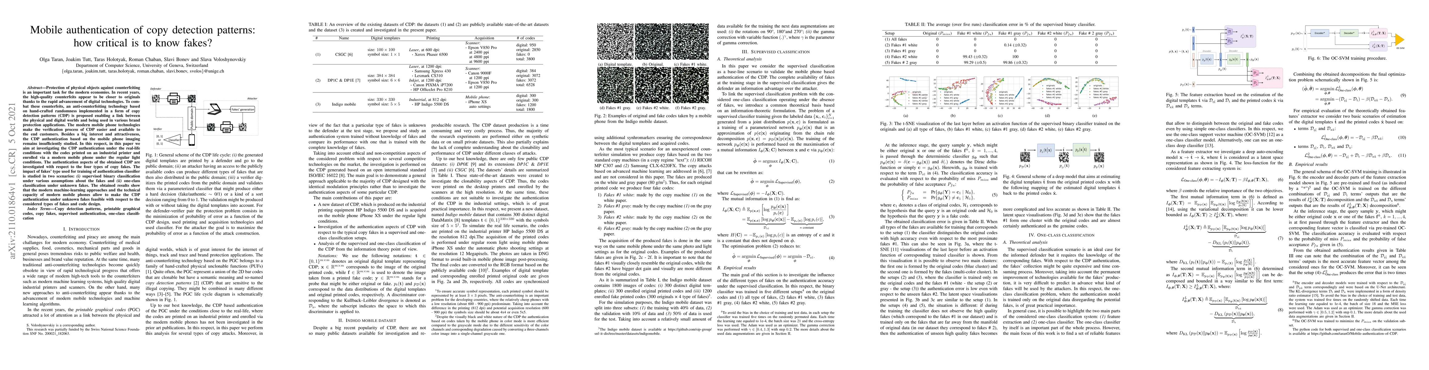 Protection of physical objects against counterfeiting is an important task for the modern economies. In recent years, the high-quality counterfeits appear to be closer to originals thanks to the rapid advancement of digital technologies. To combat these counterfeits, an anti-counterfeiting technology based on hand-crafted randomness implemented in a form of copy detection patterns (CDP) is proposed enabling a link between the physical and digital worlds and being used in various brand protection applications. The modern mobile phone technologies make the verification process of CDP easier and available to the end customers. Besides a big interest and attractiveness, the CDP authentication based on the mobile phone imaging remains insufficiently studied. In this respect, in this paper we aim at investigating the CDP authentication under the real-life conditions with the codes printed on an industrial printer and enrolled via a modern mobile phone under the regular light conditions. The authentication aspects of the obtained CDP are investigated with respect to the four types of copy fakes. The impact of fakes' type used for training of authentication classifier is studied in two scenarios: (i) supervised binary classification under various assumptions about the fakes and (ii) one-class classification under unknown fakes. The obtained results show that the modern machine-learning approaches and the technical capacity of modern mobile phones allow to make the CDP authentication under unknown fakes feasible with respect to the considered types of fakes and code design.