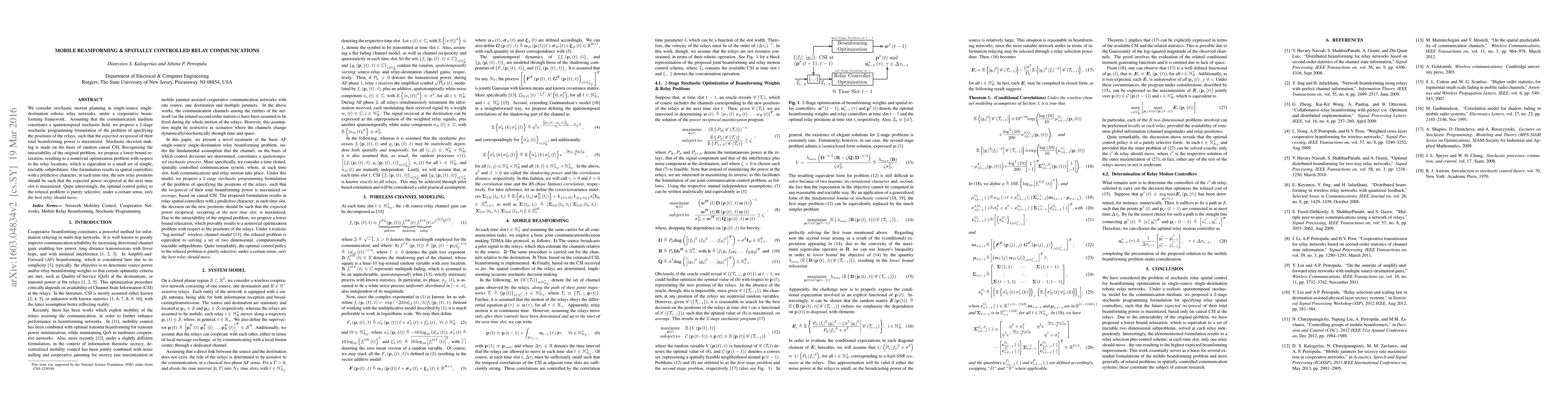 We consider stochastic motion planning in single-source single-destination robotic relay networks, under a cooperative beamforming framework. Assuming that the communication medium constitutes a spatiotemporal stochastic field, we propose a 2-stage stochastic programming formulation of the problem of specifying the positions of the relays, such that the expected reciprocal of their total beamforming power is maximized. Stochastic decision making is made on the basis of random causal CSI. Recognizing the intractability of the original problem, we propose a lower bound relaxation, resulting to a nontrivial optimization problem with respect to the relay locations, which is equivalent to a small set of simple, tractable subproblems. Our formulation results in spatial controllers with a predictive character; at each time slot, the new relay positions should be such that the expected power reciprocal at the next time slot is maximized. Quite interestingly, the optimal control policy to the relaxed problem is purely selective; under a certain sense, only the best relay should move.