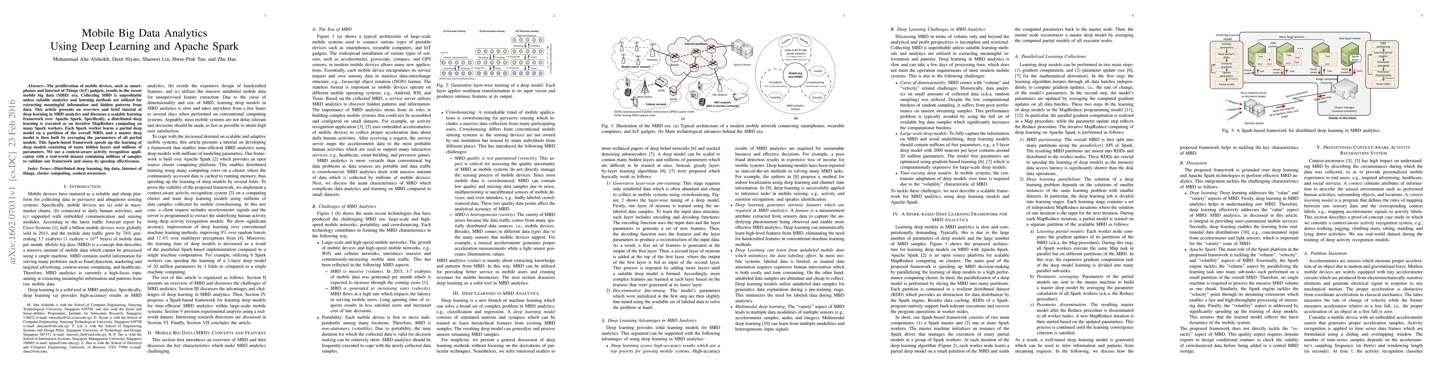 This paper explores mobile big data analytics using deep learning and Apache Spark, presenting a scalable distributed deep learning framework executed via MapReduce on Spark workers. The proposed framework speeds up the training of deep models and is validated through a context-aware activity recognition application using a large dataset.