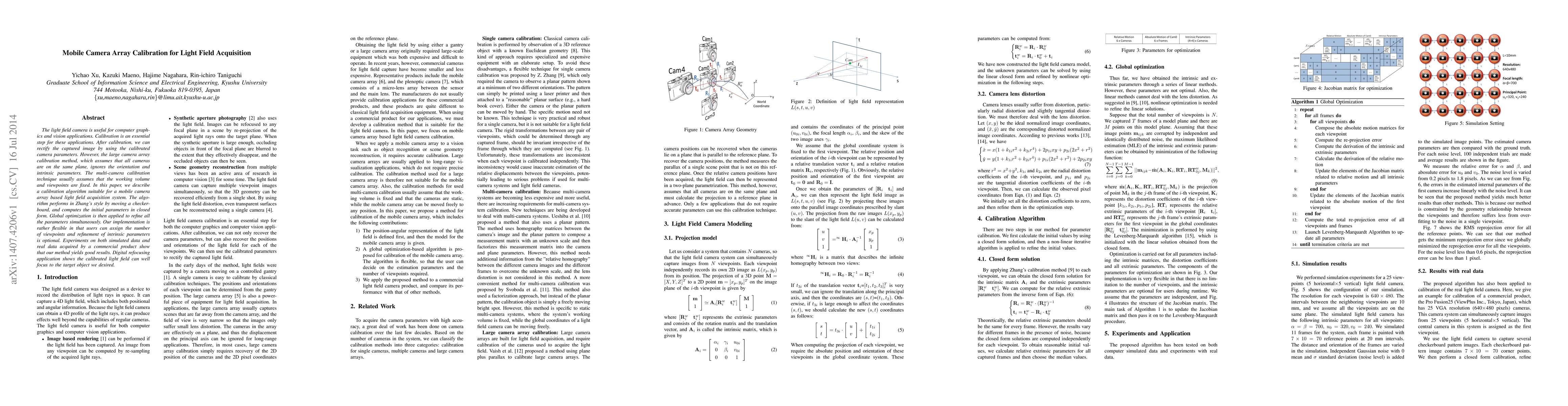 This paper presents a calibration algorithm for a mobile camera array used in light field acquisition, addressing limitations of existing methods by incorporating orientation and intrinsic parameters. The algorithm combines closed-form initial parameter computation with global optimization for refinement, demonstrating effective results in both simulated and real-world scenarios.