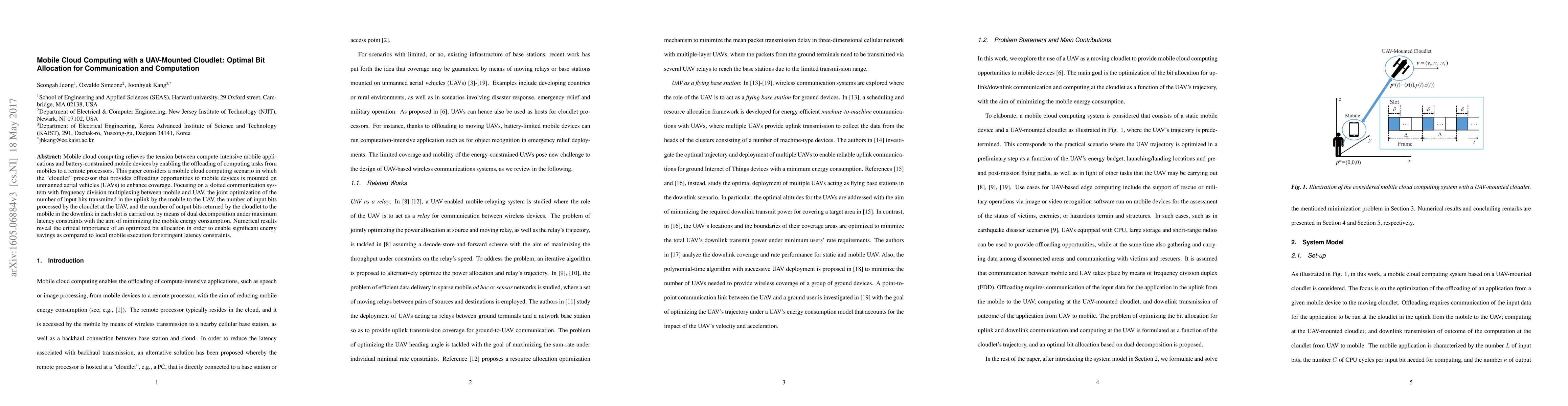 This paper optimizes bit allocation for a mobile cloud computing system utilizing UAV-mounted cloudlets to minimize mobile energy consumption under latency constraints. The study employs dual decomposition to jointly optimize uplink, processing, and downlink bit allocations, demonstrating significant energy savings compared to local execution.