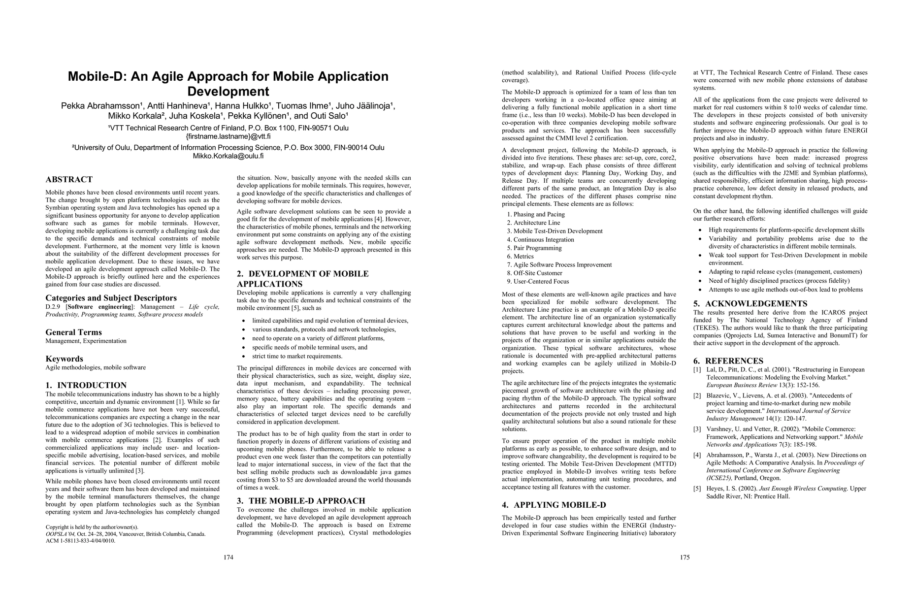 This paper presents Mobile-D, an agile approach for developing mobile applications, addressing the unique challenges and constraints of mobile development. The authors outline the approach and discuss initial experiences from four case studies to evaluate its effectiveness.