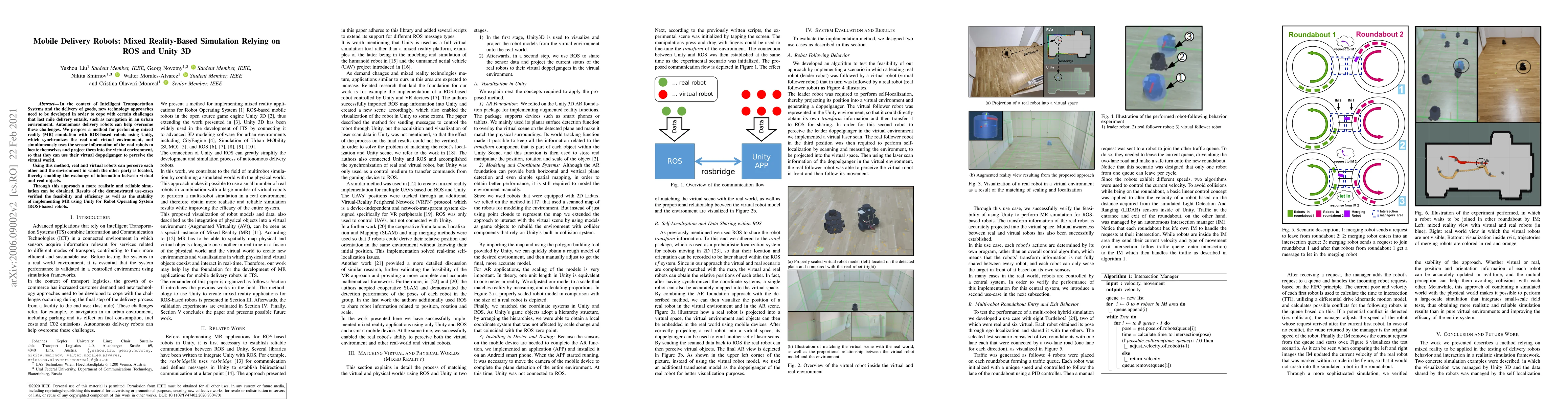 In the context of Intelligent Transportation Systems and the delivery of goods, new technology approaches need to be developed in order to cope with certain challenges that last mile delivery entails, such as navigation in an urban environment. Autonomous delivery robots can help overcome these challenges. We propose a method for performing mixed reality (MR) simulation with ROS-based robots using Unity, which synchronizes the real and virtual environment, and simultaneously uses the sensor information of the real robots to locate themselves and project them into the virtual environment, so that they can use their virtual doppelganger to perceive the virtual world. Using this method, real and virtual robots can perceive each other and the environment in which the other party is located, thereby enabling the exchange of information between virtual and real objects. Through this approach a more realistic and reliable simulation can be obtained. Results of the demonstrated use-cases verified the feasibility and efficiency as well as the stability of implementing MR using Unity for ROS-based robots.