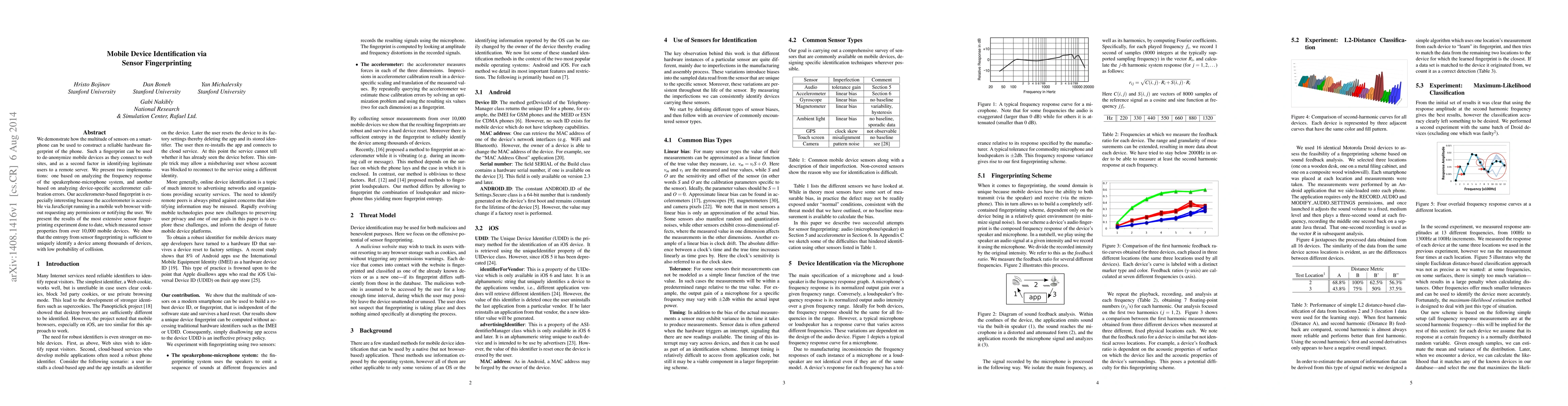 This paper explores using smartphone sensors to create unique hardware fingerprints for device identification, demonstrating two methods: speakerphone-microphone frequency analysis and accelerometer calibration error analysis. The accelerometer method is particularly noteworthy as it can be accessed via JavaScript without user permissions, achieving high identification accuracy with low collision probability based on extensive experiments with over 10,000 devices.