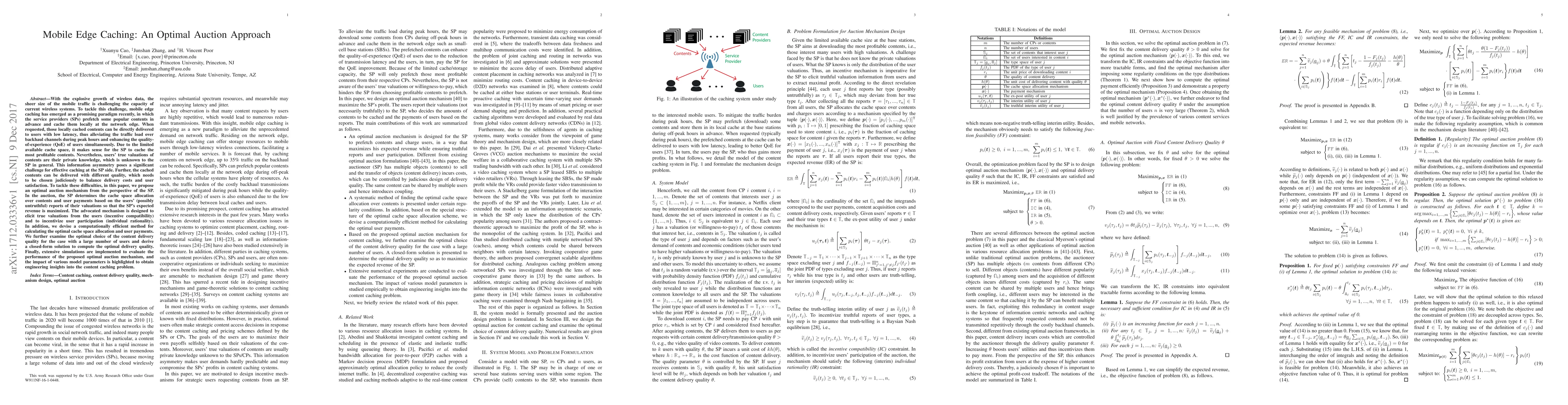 This paper proposes an optimal auction mechanism for mobile edge caching to maximize a service provider's revenue while ensuring users' truthful valuations. The proposed mechanism balances delivery costs and user satisfaction.