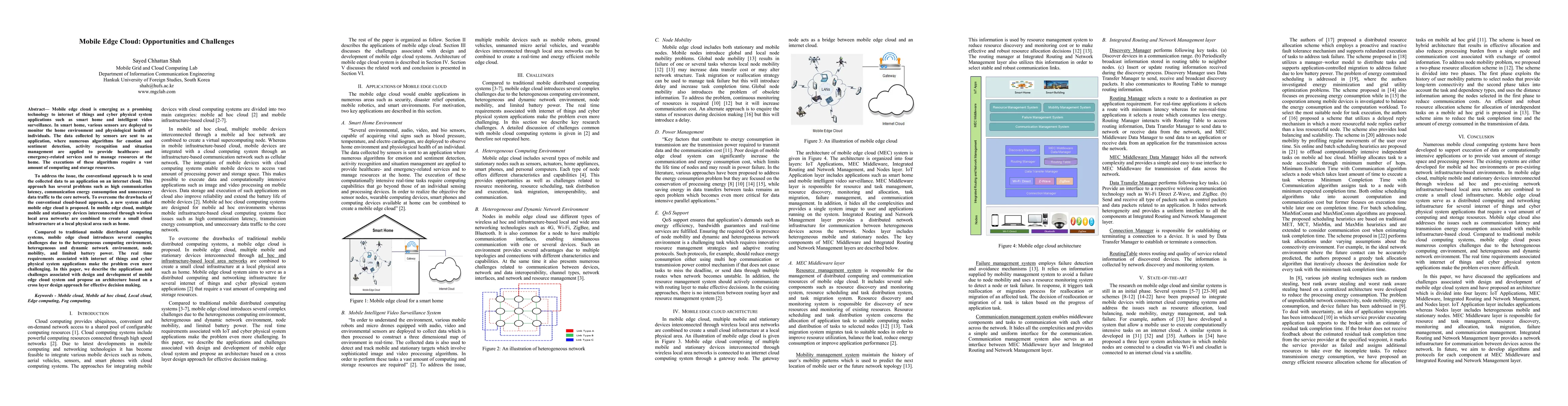The paper explores mobile edge cloud as a solution to enhance IoT and cyber-physical systems, addressing issues like high latency and energy consumption. It outlines the challenges of heterogeneous environments, node mobility, and limited power, proposing a cross-layer architecture for effective decision-making.
