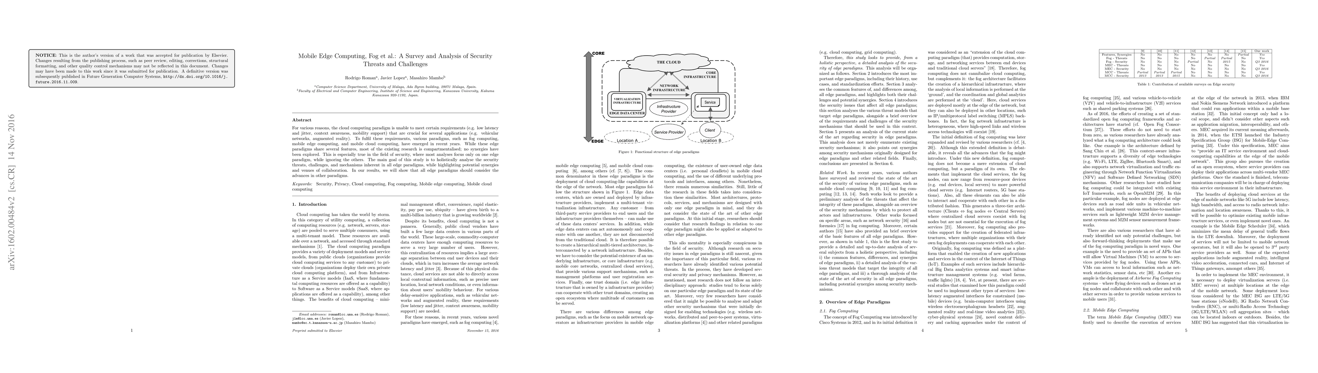This paper surveys security threats and challenges across mobile edge computing, fog computing, and related paradigms, emphasizing the need for a holistic approach to security. It highlights the importance of exploring synergies among these paradigms to enhance overall security mechanisms.