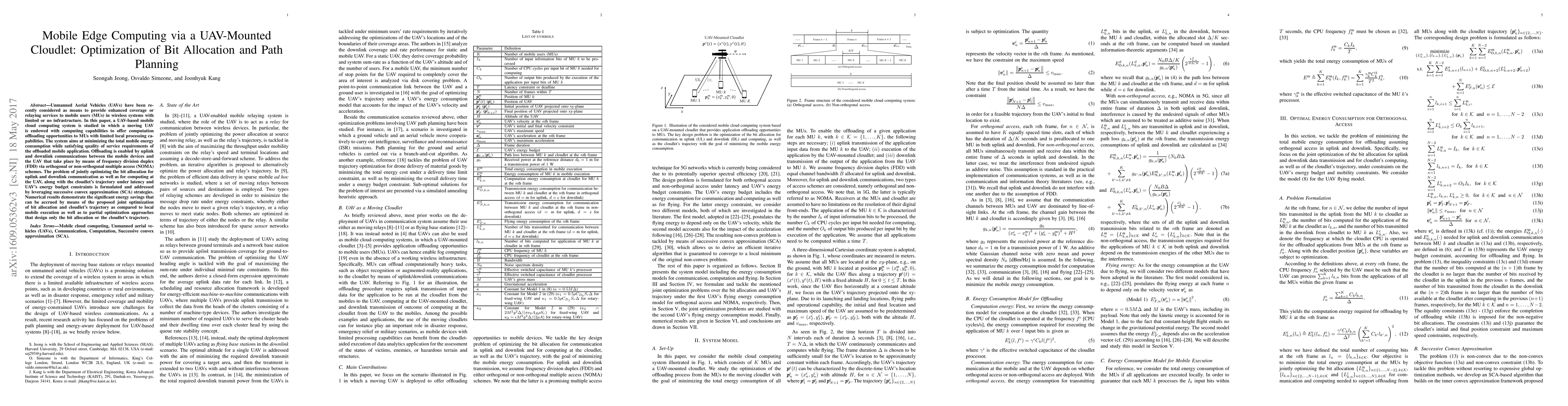Unmanned Aerial Vehicles (UAVs) have been recently considered as means to provide enhanced coverage or relaying services to mobile users (MUs) in wireless systems with limited or no infrastructure. In this paper, a UAV-based mobile cloud computing system is studied in which a moving UAV is endowed with computing capabilities to offer computation offloading opportunities to MUs with limited local processing capabilities. The system aims at minimizing the total mobile energy consumption while satisfying quality of service requirements of the offloaded mobile application. Offloading is enabled by uplink and downlink communications between the mobile devices and the UAV that take place by means of frequency division duplex (FDD) via orthogonal or non-orthogonal multiple access (NOMA) schemes. The problem of jointly optimizing the bit allocation for uplink and downlink communication as well as for computing at the UAV, along with the cloudlet's trajectory under latency and UAV's energy budget constraints is formulated and addressed by leveraging successive convex approximation (SCA) strategies. Numerical results demonstrate the significant energy savings that can be accrued by means of the proposed joint optimization of bit allocation and cloudlet's trajectory as compared to local mobile execution as well as to partial optimization approaches that design only the bit allocation or the cloudlet's trajectory.
