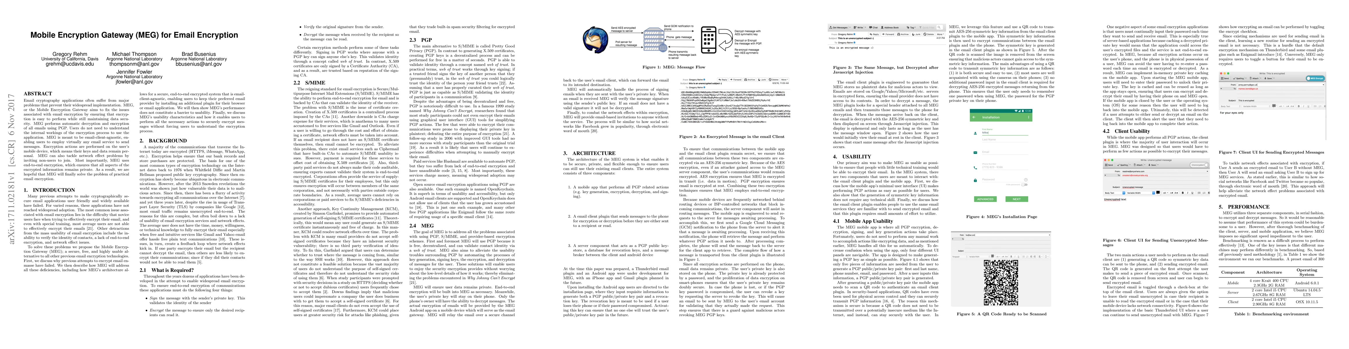 Email cryptography applications often suffer from major problems that prevent their widespread implementation. MEG, or the Mobile Encryption Gateway aims to fix the issues associated with email encryption by ensuring that encryption is easy to perform while still maintaining data security. MEG performs automatic decryption and encryption of all emails using PGP. Users do not need to understand the internal workings of the encryption process to use the application. MEG is meant to be email-client-agnostic, enabling users to employ virtually any email service to send messages. Encryption actions are performed on the user's mobile device, which means their keys and data remain personal. MEG can also tackle network effect problems by inviting non-users to join. Most importantly, MEG uses end-to-end encryption, which ensures that all aspects of the encrypted information remains private. As a result, we are hopeful that MEG will finally solve the problem of practical email encryption.