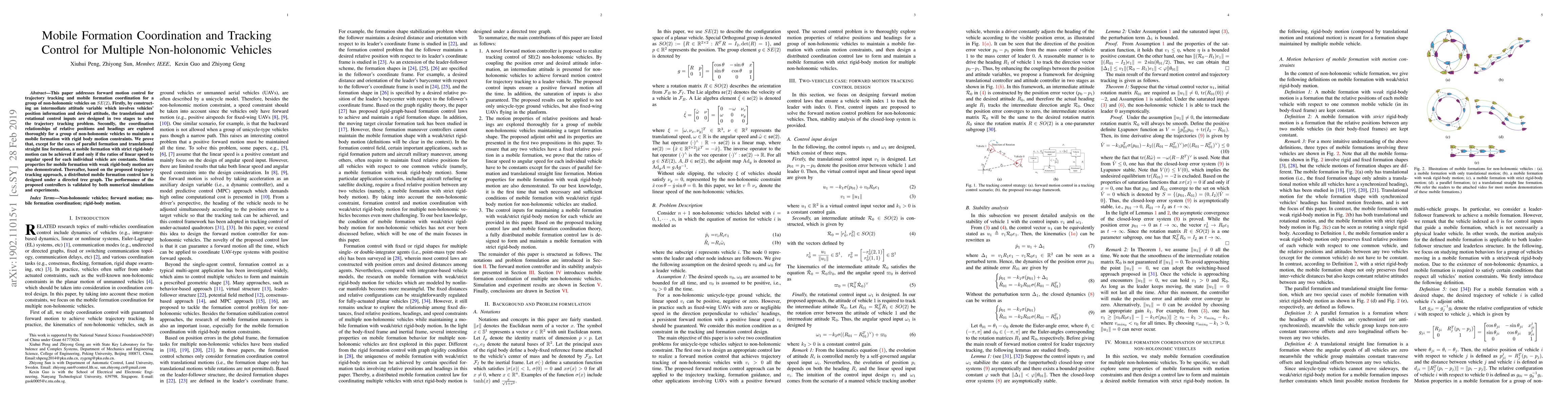 This paper presents a two-stage control strategy for trajectory tracking and mobile formation coordination of non-holonomic vehicles, proving conditions for achieving strict and weak rigid-body formations, and validating the proposed control law through simulations and experiments.