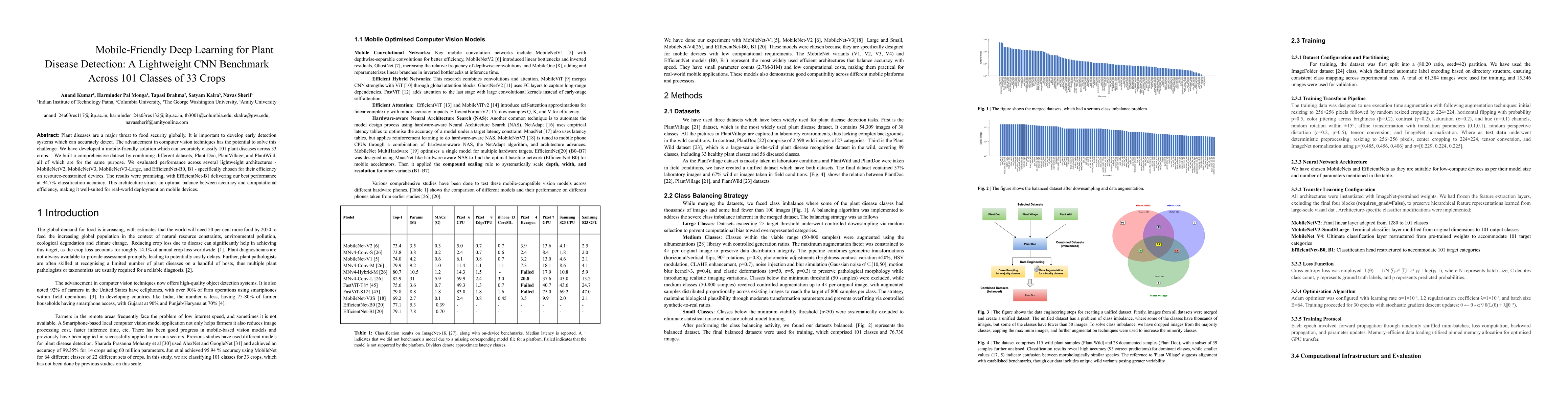 Plant diseases are a major threat to food security globally. It is important to develop early detection systems which can accurately detect. The advancement in computer vision techniques has the potential to solve this challenge. We have developed a mobile-friendly solution which can accurately classify 101 plant diseases across 33 crops. We built a comprehensive dataset by combining different datasets, Plant Doc, PlantVillage, and PlantWild, all of which are for the same purpose. We evaluated performance across several lightweight architectures - MobileNetV2, MobileNetV3, MobileNetV3-Large, and EfficientNet-B0, B1 - specifically chosen for their efficiency on resource-constrained devices. The results were promising, with EfficientNet-B1 delivering our best performance at 94.7% classification accuracy. This architecture struck an optimal balance between accuracy and computational efficiency, making it well-suited for real-world deployment on mobile devices.