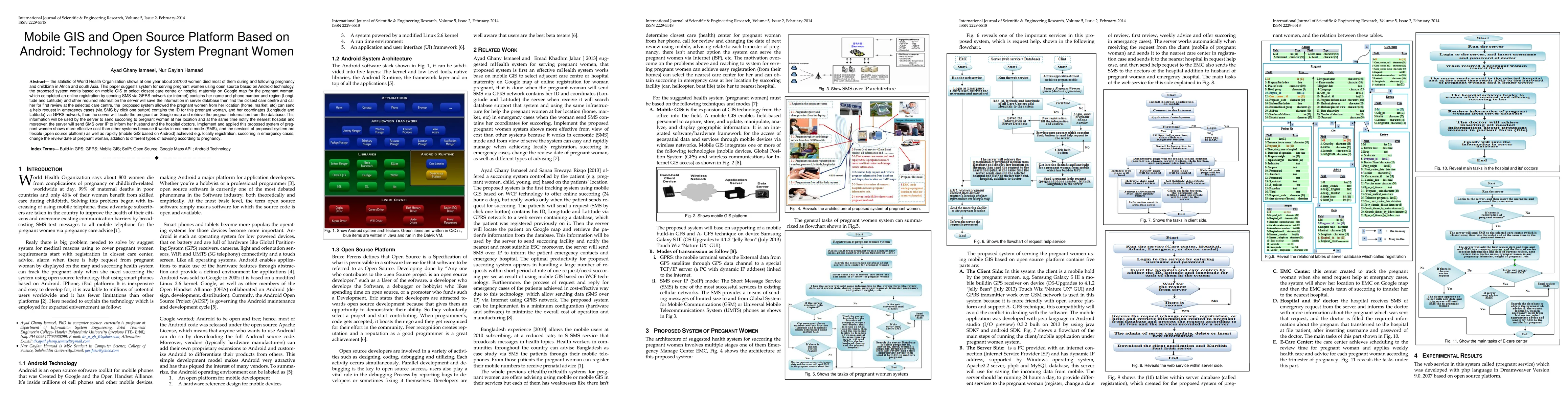 The statistic of World Health Organization shows at one year about 287000 women died most of them during and following pregnancy and childbirth in Africa and south Asia. This paper suggests system for serving pregnant women using open source based on Android technology, the proposed system works based on mobile GIS to select closest care centre or hospital maternity on Google map for the pregnant woman, which completed an online registration by sending SMS via GPRS network (or internet) contains her name and phone number and region (Longitude and Latitude) and other required information the server will save the information in server database then find the closest care centre and call her for first review at the selected care centre, the proposed system allowed the pregnant women from her location (home, market, etc) can send a help request in emergency cases (via SMS by click one button) contains the ID for this pregnant woman, and her coordinates (Longitude and Latitude) via GPRS network, then the server will locate the pregnant on Google map and retrieve the pregnant information from the database. This information will be used by the server to send succoring to pregnant woman at her location and at the same time notify the nearest hospital and moreover, the server will send SMS over IP to inform her husband and the hospital doctors. Implement and applied this proposed system of pregnant women shows more effective cost than other systems because it works in economic mode (SMS), and the services of proposed system are flexible (open source platform) as well as rapidly (mobile GIS based on Android) achieved locally registration, succoring in emergency cases, change the review date of pregnant woman, addition to different types of advising according to pregnancy. Index Terms: Build-in GPS; GPRS; Mobile GIS; SoIP; Open Source; Google Maps API ; Android Technology
