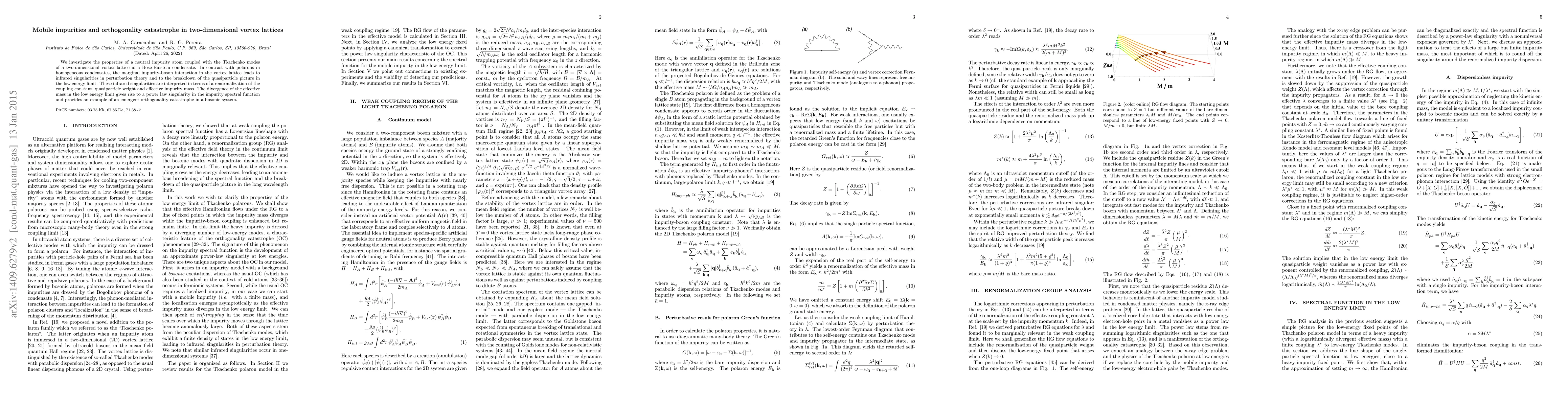 We investigate the properties of a neutral impurity atom coupled with the Tkachenko modes of a two-dimensional vortex lattice Bose-Einstein condensate. In contrast with polarons in homogeneous condensates, the marginal impurity-boson interaction in the vortex lattice leads to infrared singularities in perturbation theory and to the breakdown of the quasiparticle picture in the low energy limit. These infrared singularities are interpreted in terms of a renormalization of the coupling constant, quasiparticle weight and effective impurity mass. The divergence of the effective mass in the low energy limit gives rise to an orthogonality catastrophe which is manifested as a power law singularity in the impurity spectral function.