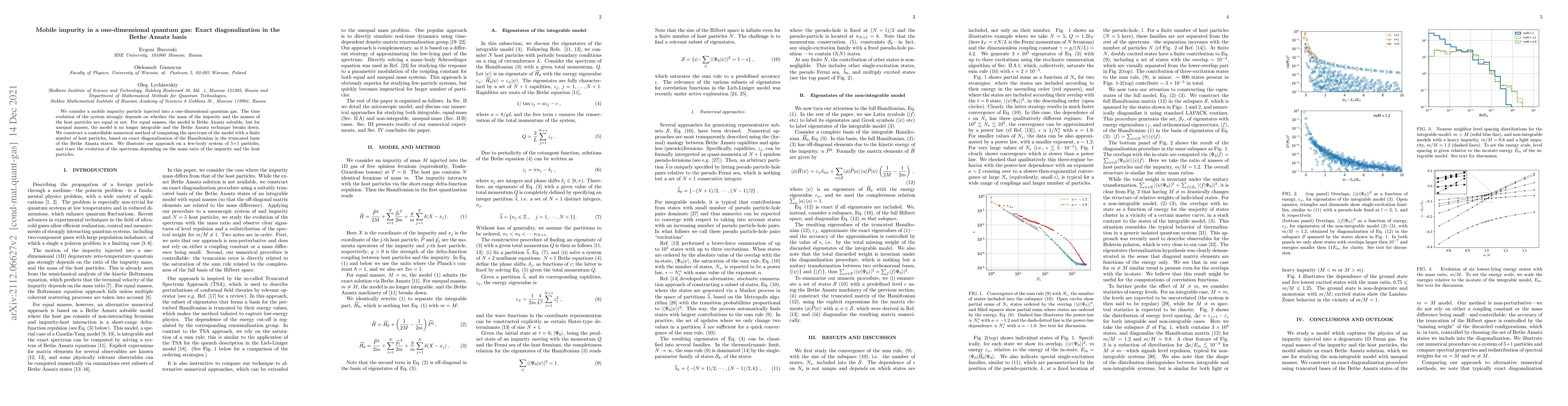 This paper investigates the dynamics of a mobile impurity in a one-dimensional quantum gas, employing exact diagonalization in the Bethe Ansatz basis to compute the system's spectrum. It highlights the differences in time evolution for equal versus unequal impurity and host particle masses, and demonstrates the method's effectiveness in a 5+1 particle system.