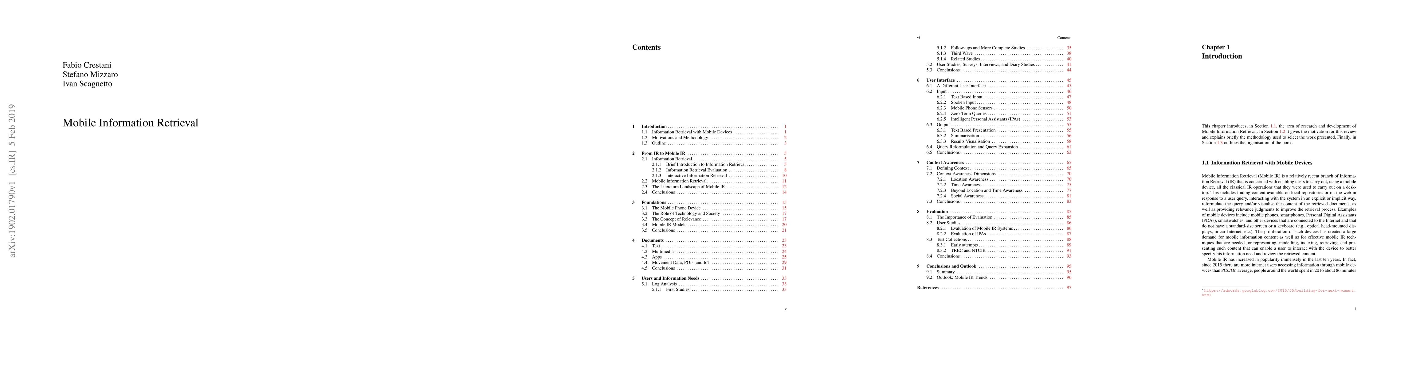 Mobile Information Retrieval (Mobile IR) is a relatively recent branch of Information Retrieval (IR) that is concerned with enabling users to carry out, using a mobile device, all the classical IR operations that they were used to carry out on a desktop. This includes finding content available on local repositories or on the web in response to a user query, interacting with the system in an explicit or implicit way, reformulate the query and/or visualise the content of the retrieved documents, as well as providing relevance judgments to improve the retrieval process. This book is structured as follows. Chapter 2 provides a very brief overview of IR and of Mobile IR, briefly outlining what in Mobile IR is different from IR. Chapter 3 provides the foundations of Mobile IR, looking at the characteristics of mobile devices and what they bring to IR, but also looking at how the concept of relevance changed from standard IR to Mobile IR. Chapter 4 presents an overview of the document collections that are searchable by a Mobile IR system, and that are somehow different from classical IR ones; available for experimentation, including collections of data that have become complementary to Mobile IR. Similarly, Chapter 5 reviews mobile information needs studies and users log analysis. Chapter 6 reviews studies aimed at adapting and improving the users interface to the needs of Mobile IR. Chapter 7, instead, reviews work on context awareness, which studies the many aspects of the user context that Mobile IR employs. Chapter 8 reviews some of evaluation work done in Mobile IR, highlighting the distinctions with classical IR from the perspectives of two main IR evaluation methodologies: users studies and test collections. Finally, Chapter 9 reports the conclusions of this review, highlighting briefly some trends in Mobile IR that we believe will drive research in the next few years.