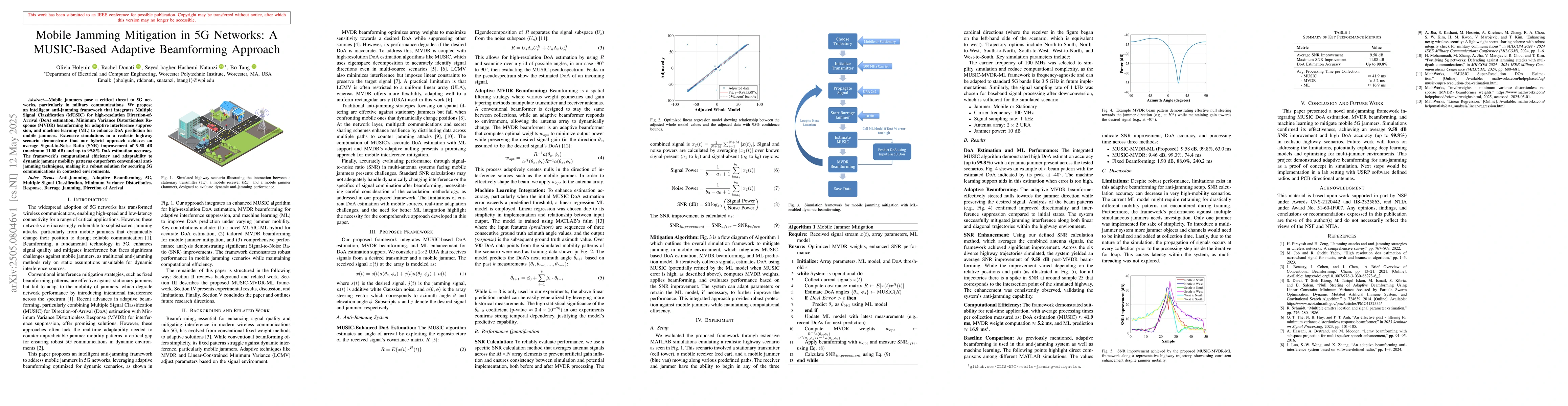 A new anti-jamming framework combines MUSIC-based direction-of-arrival estimation, adaptive beamforming, and machine learning to improve 5G network security against mobile jammers, achieving up to 99.8% accuracy and 9.58 dB SNR improvement.