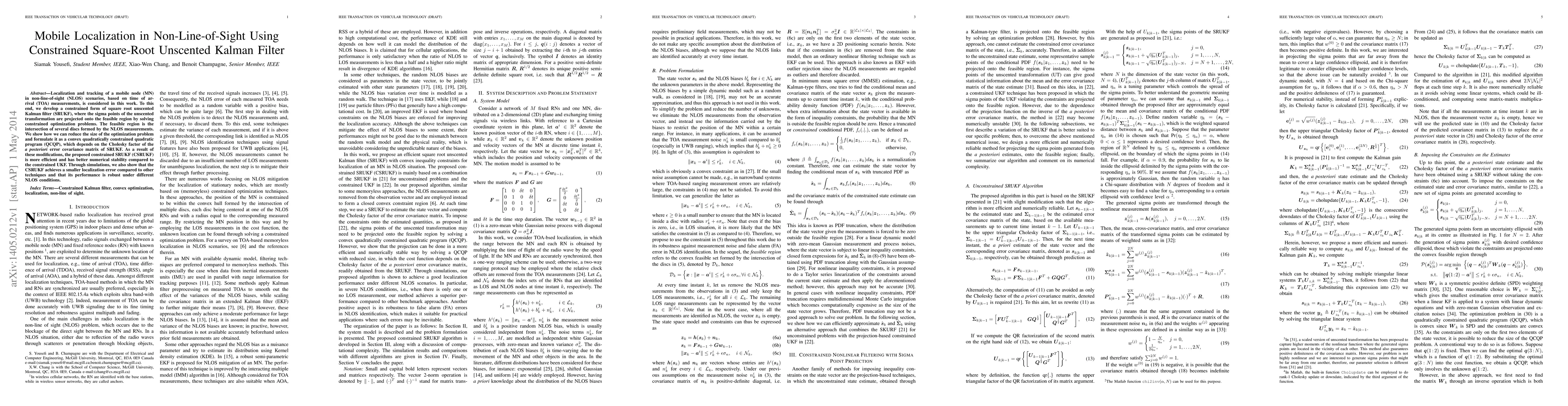 A new method for mobile localization in non-line-of-sight scenarios uses a constrained square-root unscented Kalman filter to achieve better performance and numerical stability than existing techniques.