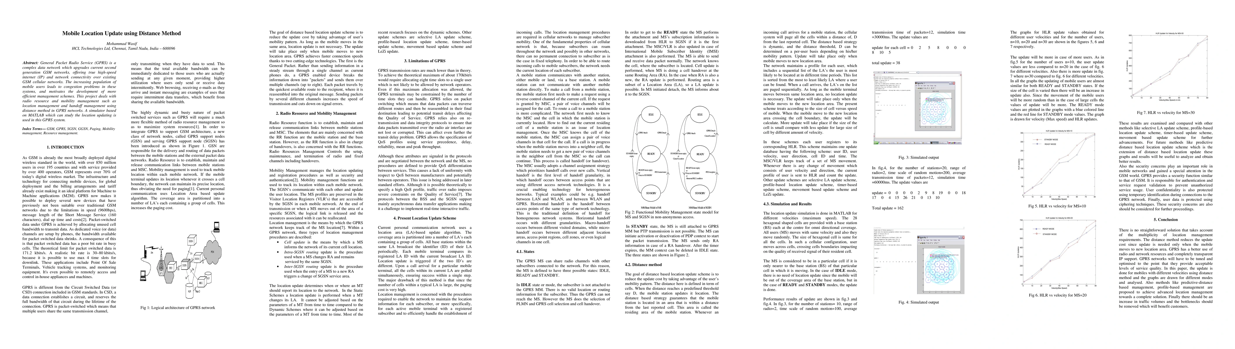 General Packet Radio Service (GPRS) is a complex data network which upgrades current second generation GSM networks, offering true high-speed internet (IP) and network connectivity over existing GSM cellular networks. The increasing population of mobile users leads to congestion problems in these systems, and motivates the development of more efficient management schemes. This project deals with radio resource and mobility management such as location management and handoff management using distance method in GPRS networks. A simulator based on MATLAB which can study the location updating is used in this GPRS system.