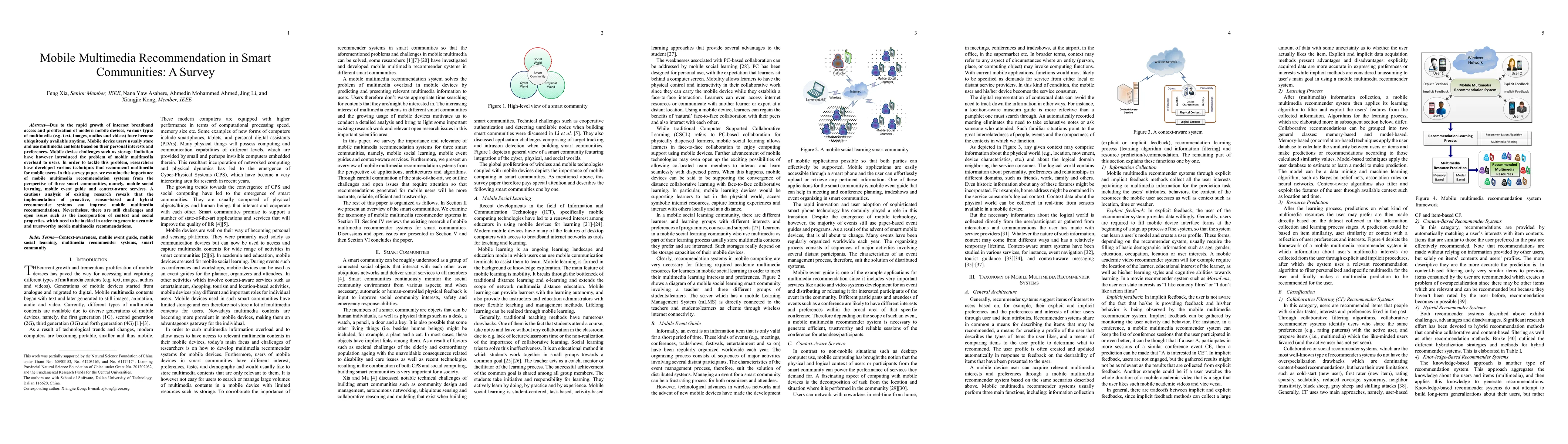 This paper surveys mobile multimedia recommendation techniques in smart communities, focusing on mobile social learning, mobile event guides, and context-aware services. It highlights the effectiveness of proactive, sensor-based, and hybrid recommender systems but notes ongoing challenges in incorporating context and social properties for accurate recommendations.