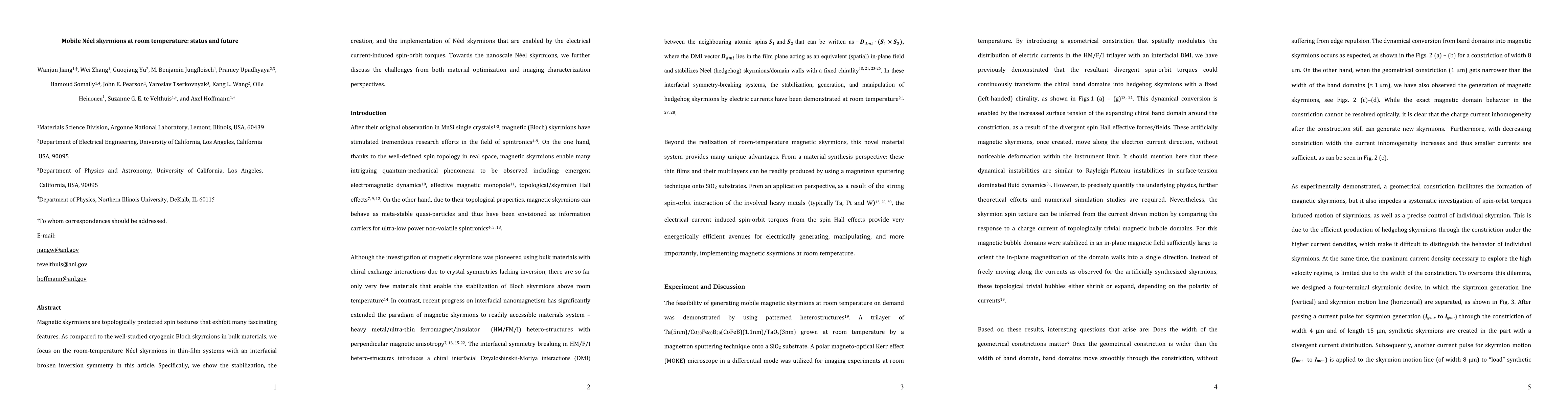 This paper explores the stabilization, creation, and implementation of room-temperature Néel skyrmions in thin-film systems using electrical current-induced spin-orbit torques. It also discusses the challenges of material optimization and nanoscale imaging characterization for future advancements.