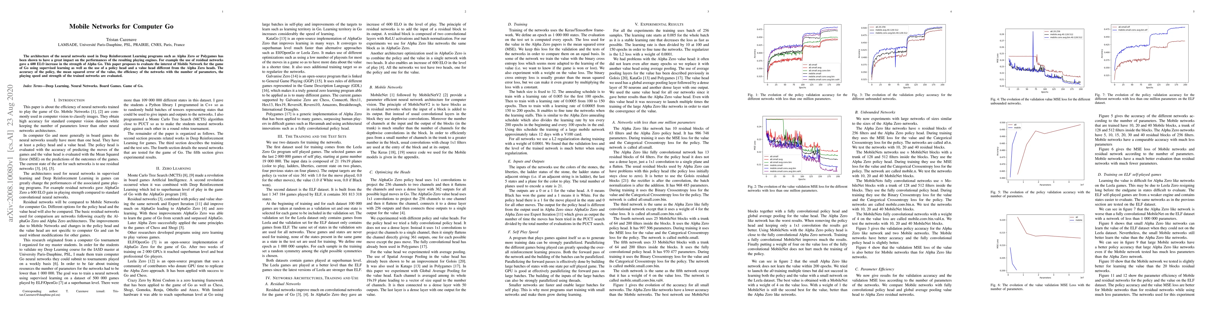 The architecture of the neural networks used in Deep Reinforcement Learning programs such as Alpha Zero or Polygames has been shown to have a great impact on the performances of the resulting playing engines. For example the use of residual networks gave a 600 ELO increase in the strength of Alpha Go. This paper proposes to evaluate the interest of Mobile Network for the game of Go using supervised learning as well as the use of a policy head and a value head different from the Alpha Zero heads. The accuracy of the policy, the mean squared error of the value, the efficiency of the networks with the number of parameters, the playing speed and strength of the trained networks are evaluated.