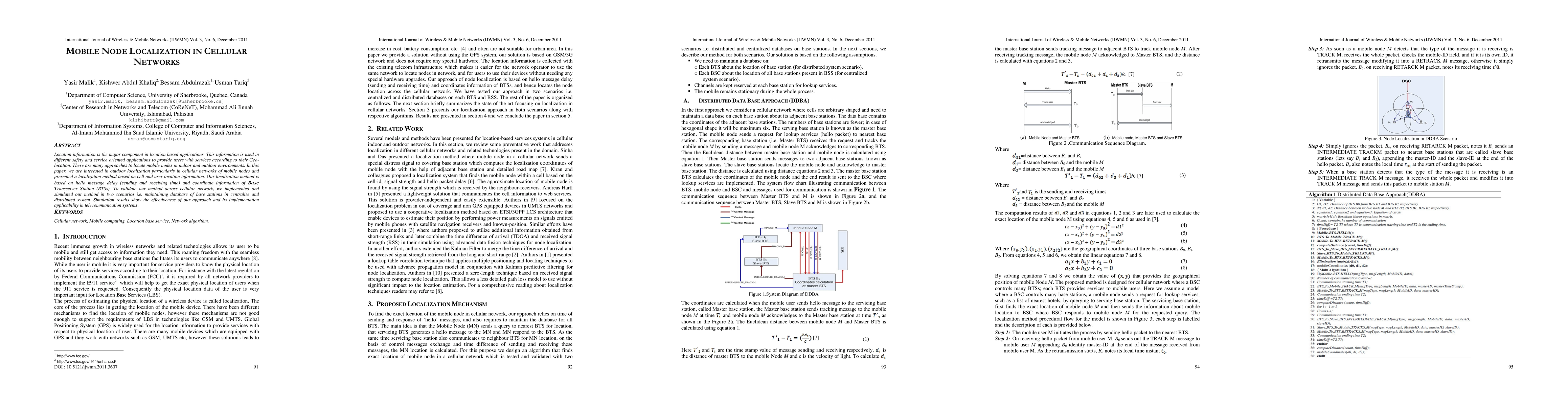 Location information is the major component in location based applications. This information is used in different safety and service oriented applications to provide users with services according to their Geolocation. There are many approaches to locate mobile nodes in indoor and outdoor environments. In this paper, we are interested in outdoor localization particularly in cellular networks of mobile nodes and presented a localization method based on cell and user location information. Our localization method is based on hello message delay (sending and receiving time) and coordinate information of Base Transceiver Station (BTSs). To validate our method across cellular network, we implemented and simulated our method in two scenarios i.e. maintaining database of base stations in centralize and distributed system. Simulation results show the effectiveness of our approach and its implementation applicability in telecommunication systems.