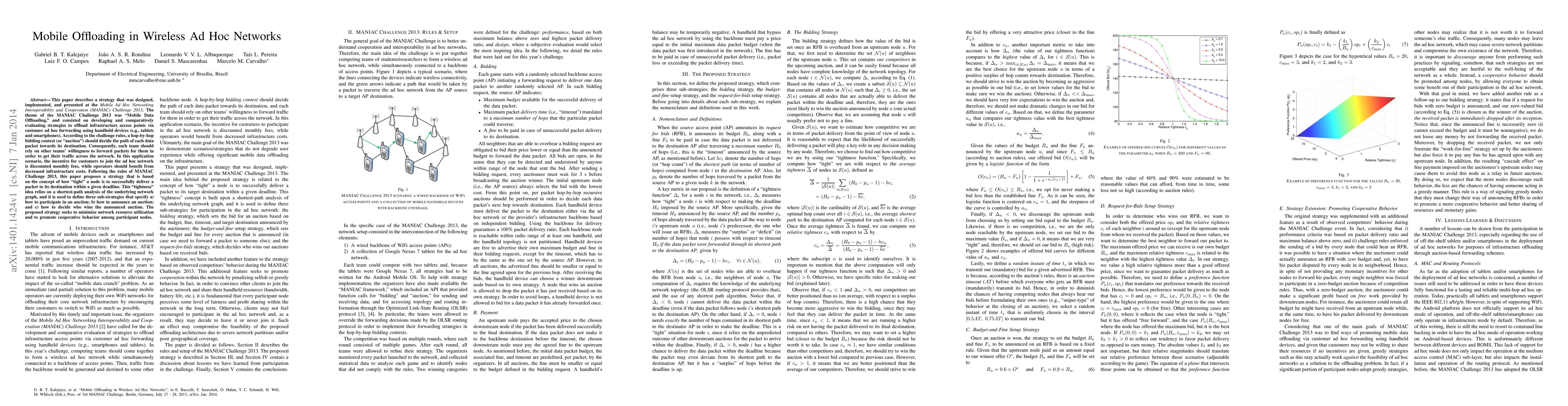 This paper presents a strategy for mobile data offloading in wireless ad hoc networks, developed for the MANIAC Challenge 2013. It uses a "tightness" concept based on shortest-path analysis to define sub-strategies for auction participation, announcement, and winner determination, aiming to minimize resource use and encourage cooperative forwarding among nodes.