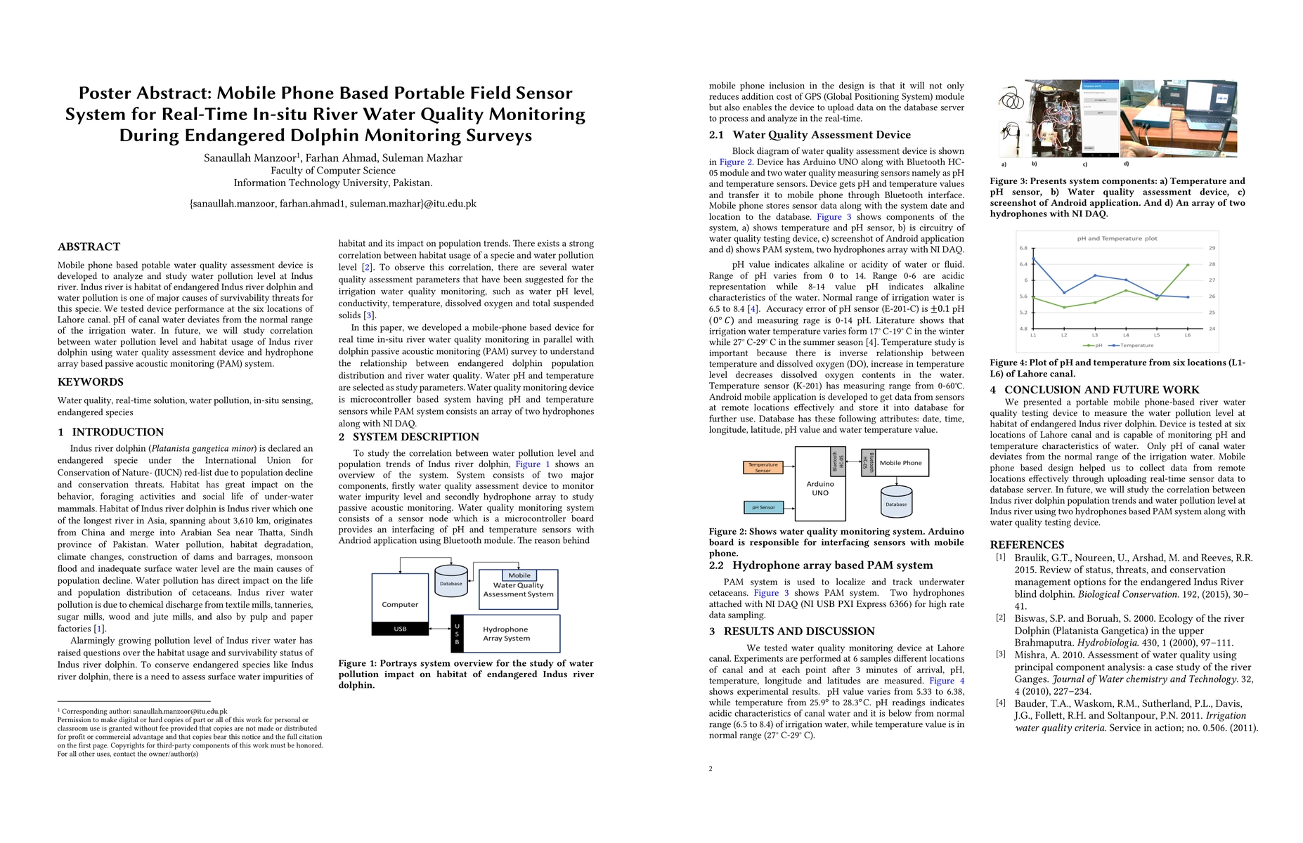 Mobile phone based potable water quality assessment device is developed to analyze and study water pollution level at Indus river. Indus river is habitat of endangered Indus river dolphin and water pollution is one of major causes of survivability threats for this specie. We tested device performance at the six locations of Lahore canal. pH of canal water deviates from the normal range of the irrigation water. In future, we will study correlation between water pollution level and habitat usage of Indus river dolphin using water quality assessment device and hydrophone array based passive acoustic monitoring (PAM) system.