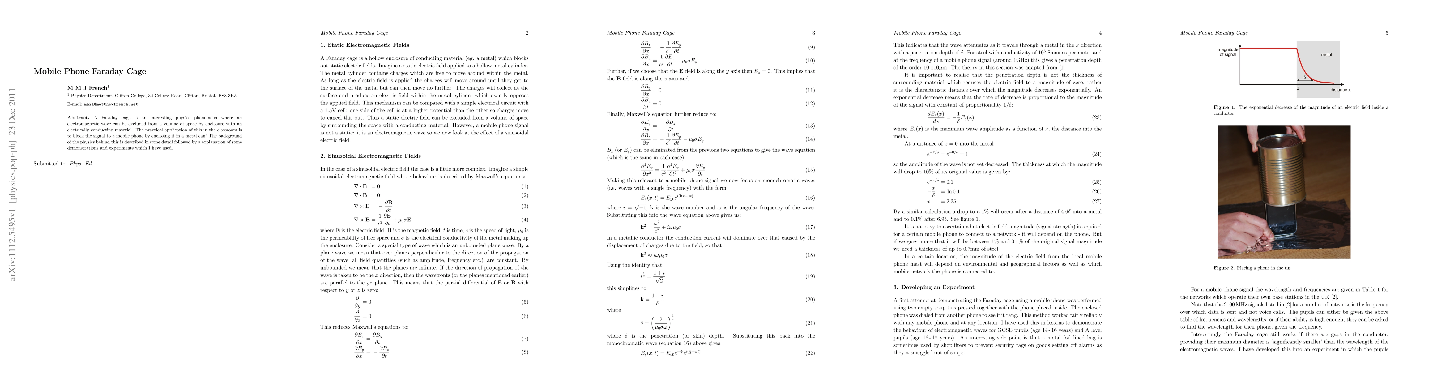 A Faraday cage is an interesting physics phenomena where an electromagnetic wave can be excluded from a volume of space by enclosure with an electrically conducting material. The practical application of this in the classroom is to block the signal to a mobile phone by enclosing it in a metal can! The background of the physics behind this is described in some detail followed by a explanation of some demonstrations and experiments which I have used.