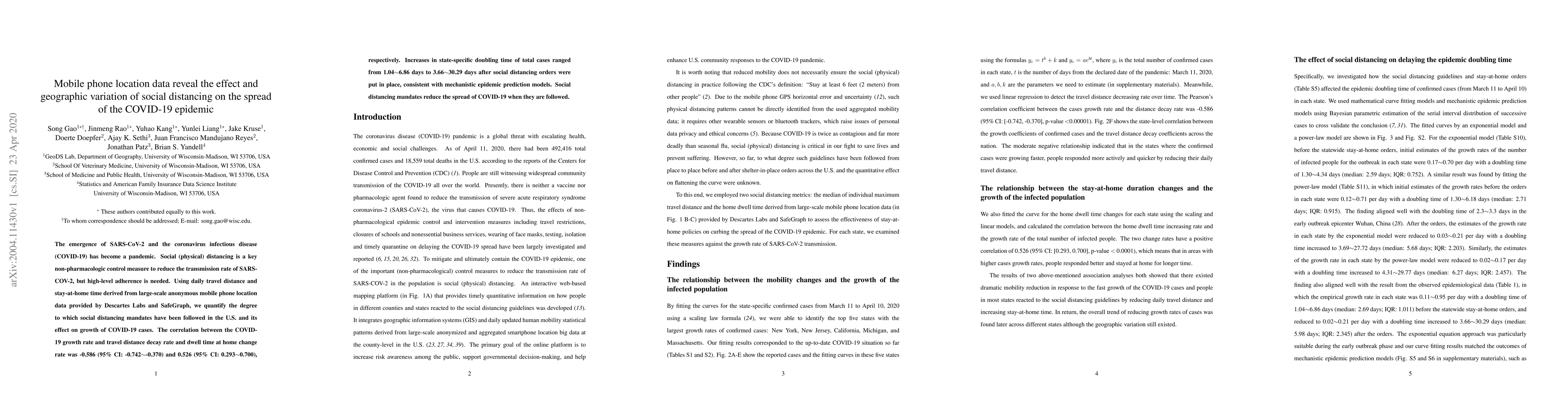 This study uses mobile phone location data to assess the impact of social distancing on COVID-19 spread in the U.S. The analysis shows a strong negative correlation between reduced travel and increased stay-at-home times and the decline in COVID-19 growth rates, indicating that adherence to social distancing mandates significantly slows the epidemic.