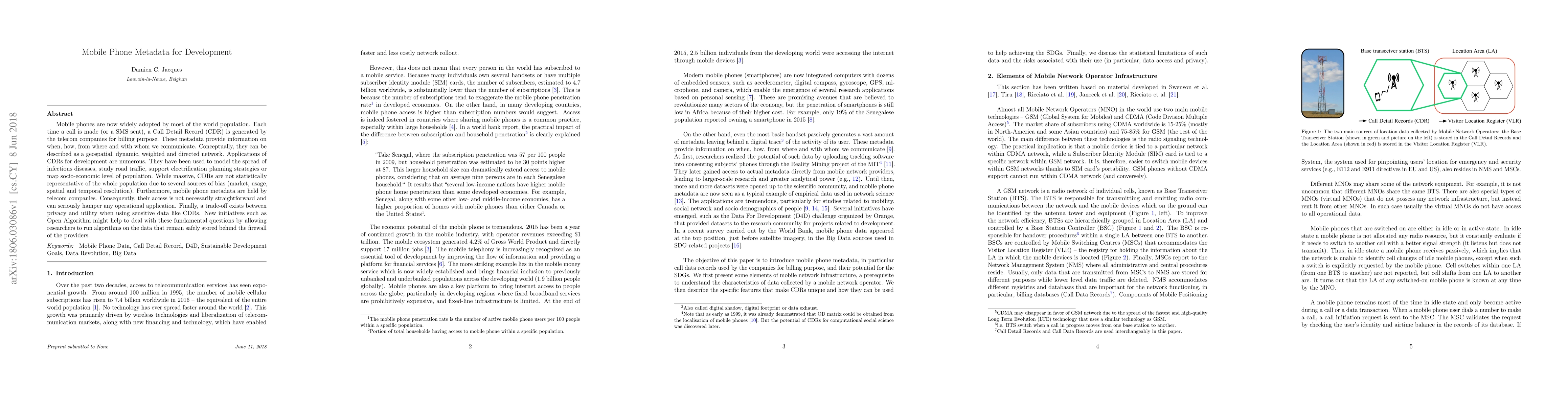 Mobile phones are now widely adopted by most of the world population. Each time a call is made (or an SMS sent), a Call Detail Record (CDR) is generated by the telecom companies for billing purpose. These metadata provide information on when, how, from where and with whom we communicate. Conceptually, they can be described as a geospatial, dynamic, weighted and directed network. Applications of CDRs for development are numerous. They have been used to model the spread of infectious diseases, study road traffic, support electrification planning strategies or map socio-economic level of population. While massive, CDRs are not statistically representative of the whole population due to several sources of bias (market, usage, spatial and temporal resolution). Furthermore, mobile phone metadata are held by telecom companies. Consequently, their access is not necessarily straightforward and can seriously hamper any operational application. Finally, a trade-off exists between privacy and utility when using sensitive data like CDRs. New initiatives such as Open Algorithm might help to deal with these fundamental questions by allowing researchers to run algorithms on the data that remain safely stored behind the firewall of the providers.