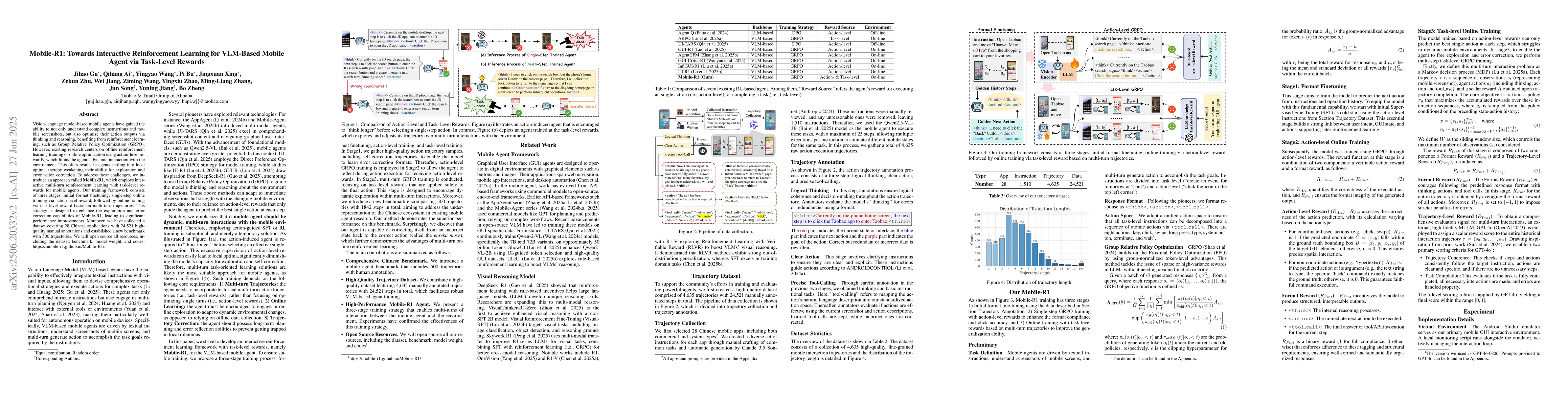 Vision-language model-based mobile agents have gained the ability to not only understand complex instructions and mobile screenshots, but also optimize their action outputs via thinking and reasoning, benefiting from reinforcement learning, such as Group Relative Policy Optimization (GRPO). However, existing research centers on offline reinforcement learning training or online optimization using action-level rewards, which limits the agent's dynamic interaction with the environment. This often results in agents settling into local optima, thereby weakening their ability for exploration and error action correction. To address these challenges, we introduce an approach called Mobile-R1, which employs interactive multi-turn reinforcement learning with task-level rewards for mobile agents. Our training framework consists of three stages: initial format finetuning, single-step online training via action-level reward, followed by online training via task-level reward based on multi-turn trajectories. This strategy is designed to enhance the exploration and error correction capabilities of Mobile-R1, leading to significant performance improvements. Moreover, we have collected a dataset covering 28 Chinese applications with 24,521 high-quality manual annotations and established a new benchmark with 500 trajectories. We will open source all resources, including the dataset, benchmark, model weight, and codes: https://mobile-r1.github.io/Mobile-R1/.