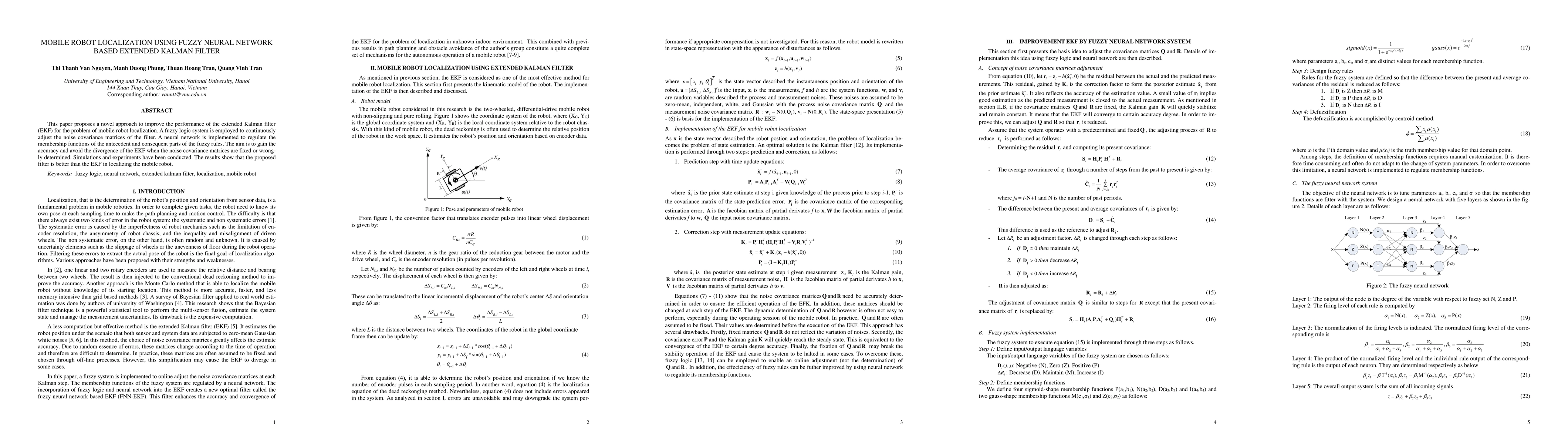 This paper proposes a novel approach to improve the performance of the extended Kalman filter (EKF) for the problem of mobile robot localization. A fuzzy logic system is employed to continuous-ly adjust the noise covariance matrices of the filter. A neural network is implemented to regulate the membership functions of the antecedent and consequent parts of the fuzzy rules. The aim is to gain the accuracy and avoid the divergence of the EKF when the noise covariance matrices are fixed or wrongly determined. Simulations and experiments have been conducted. The results show that the proposed filter is better than the EKF in localizing the mobile robot.