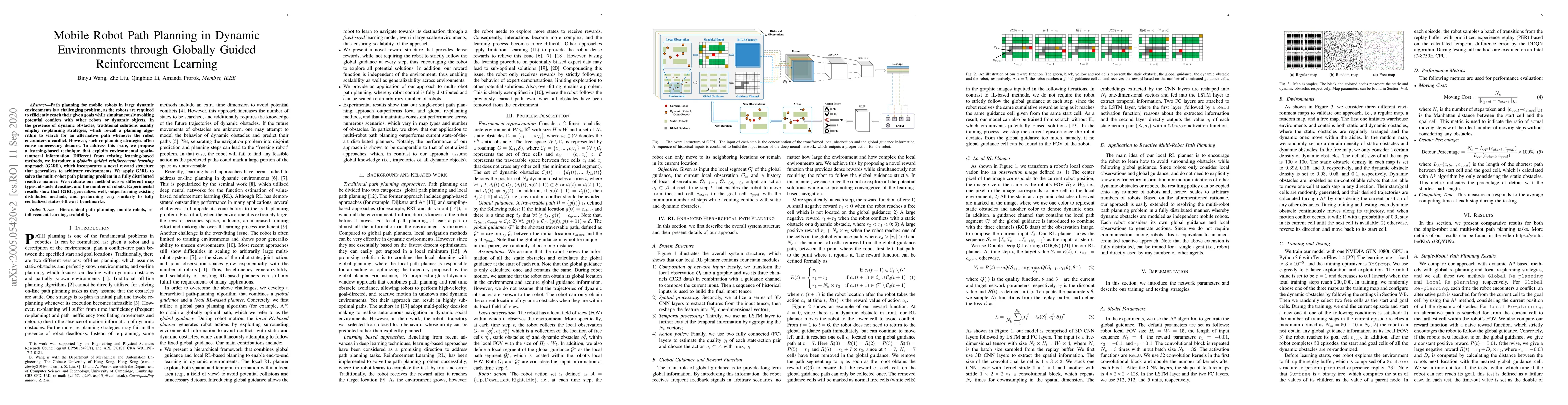 This paper proposes a globally guided reinforcement learning approach (G2RL) for mobile robot path planning in dynamic environments, aiming to efficiently navigate while avoiding conflicts. Experimental results show G2RL outperforms distributed methods and performs nearly as well as centralized benchmarks across various environments.