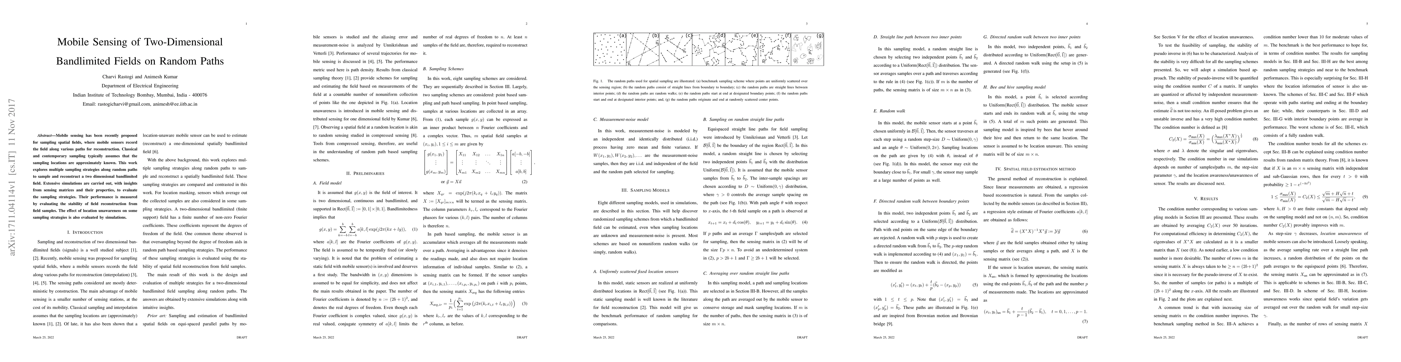 Mobile sensing has been recently proposed for sampling spatial fields, where mobile sensors record the field along various paths for reconstruction. Classical and contemporary sampling typically assumes that the sampling locations are approximately known. This work explores multiple sampling strategies along random paths to sample and reconstruct a two dimensional bandlimited field. Extensive simulations are carried out, with insights from sensing matrices and their properties, to evaluate the sampling strategies. Their performance is measured by evaluating the stability of field reconstruction from field samples. The effect of location unawareness on some sampling strategies is also evaluated by simulations.