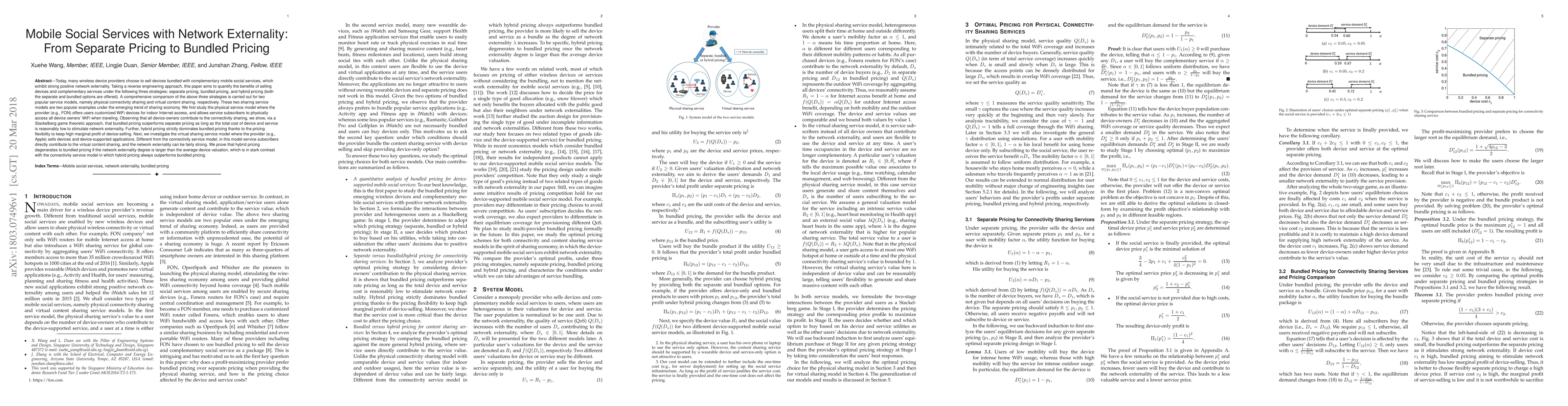 This paper compares three pricing strategies—separate, bundled, and hybrid—for mobile social services with network externality. It finds that bundled pricing is optimal for physical connectivity sharing, while hybrid pricing offers greater flexibility and higher profits. However, in virtual content sharing, hybrid pricing can degenerate to bundled pricing when network externality is high.