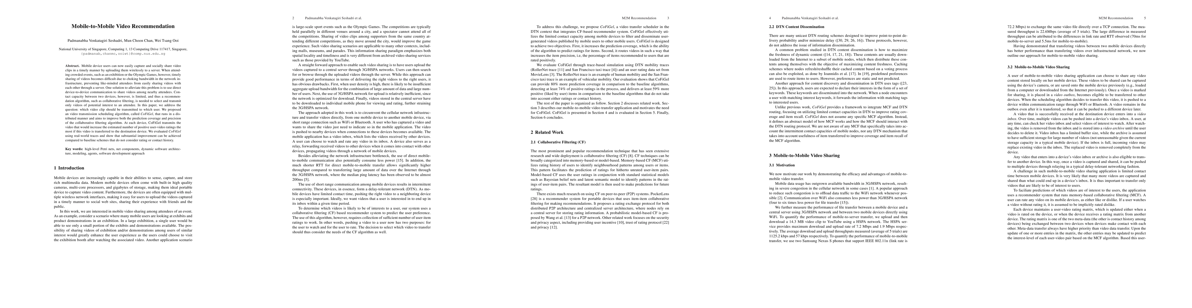 Mobile device users can now easily capture and socially share video clips in a timely manner by uploading them wirelessly to a server. When attending crowded events, such as an exhibition or the Olympic Games, however, timely sharing of videos becomes difficult due to choking bandwidth in the network infrastructure, preventing like-minded attendees from easily sharing videos with each other through a server. One solution to alleviate this problem is to use direct device-to-device communication to share videos among nearby attendees. Contact capacity between two devices, however, is limited, and thus a recommendation algorithm, such as collaborative filtering, is needed to select and transmit only videos of potential interest to an attendee. In this paper, we address the question: which video clip should be transmitted to which user. We proposed an video transmission scheduling algorithm, called CoFiGel, that runs in a distributed manner and aims to improve both the prediction coverage and precision of the collaborative filtering algorithm. At each device, CoFiGel transmits the video that would increase the estimated number of positive user-video ratings the most if this video is transferred to the destination device. We evaluated CoFiGel using real-world traces and show that substantial improvement can be achieved compared to baseline schemes that do not consider rating or contact history.
