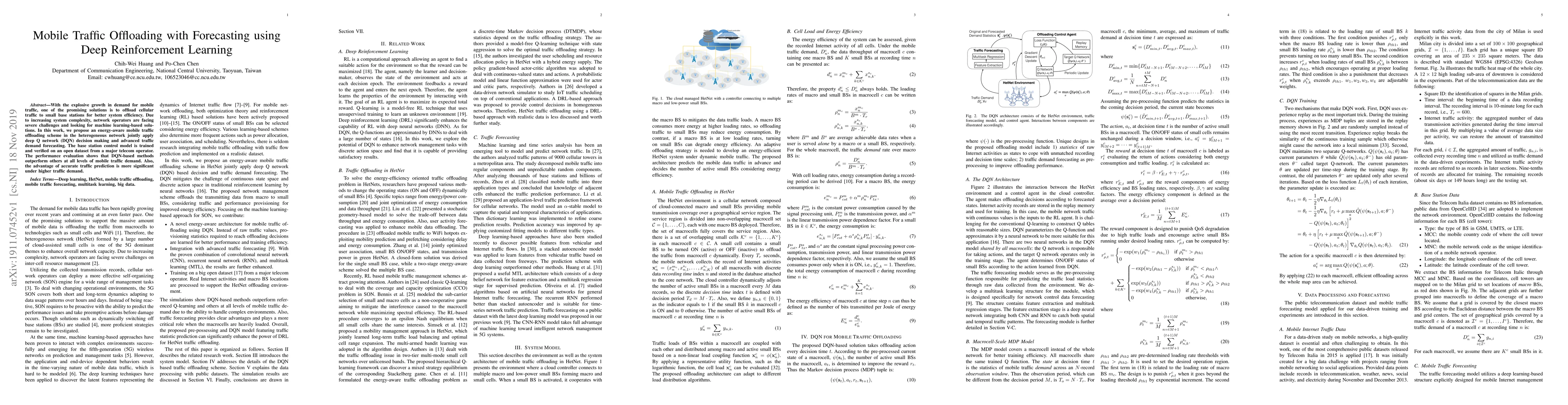 This paper proposes an energy-efficient mobile traffic offloading scheme using deep reinforcement learning and advanced traffic forecasting. The deep Q network (DQN) method outperforms traditional methods, especially under high traffic demand, demonstrating the benefits of accurate traffic prediction.