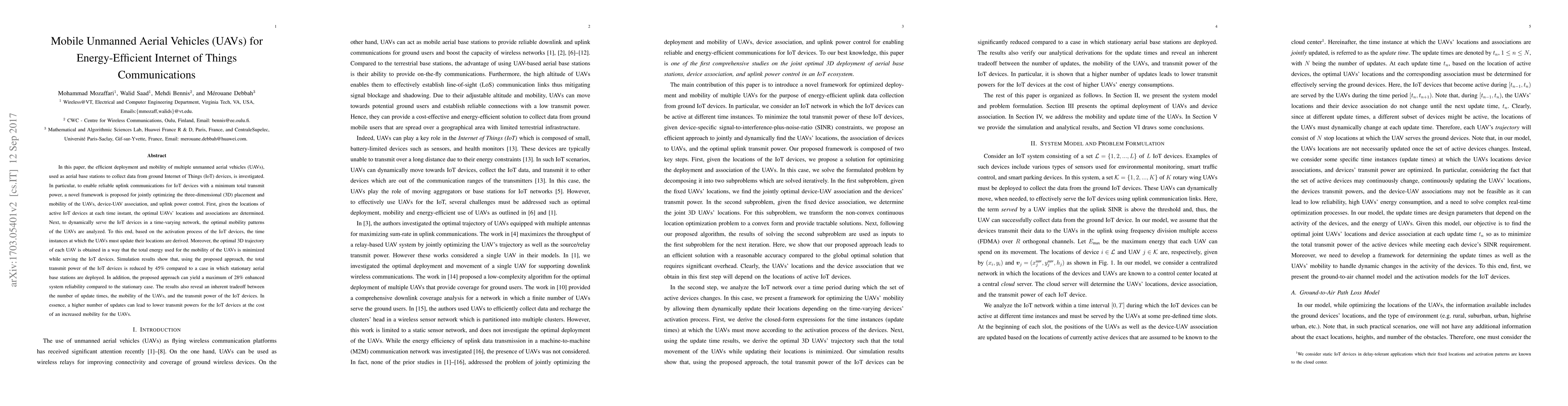This paper proposes a novel framework for optimizing the 3D placement and mobility of mobile UAVs to serve IoT devices, achieving a 45% reduction in IoT devices' transmit power compared to stationary base stations. The approach optimizes UAV mobility patterns to minimize energy use while enhancing system reliability by up to 28%.