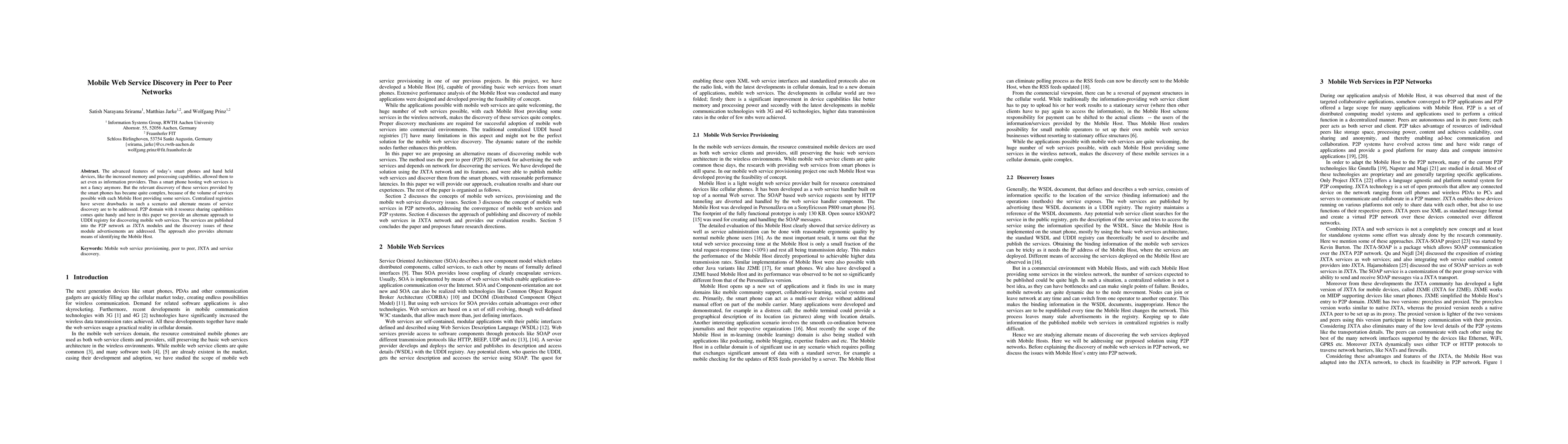 This paper proposes an alternative to centralized UDDI registries for discovering mobile web services in peer-to-peer networks, leveraging JXTA modules for service publication and addressing discovery issues within the P2P domain. The approach aims to overcome the limitations of centralized registries in managing the complexity of service discovery in mobile environments.