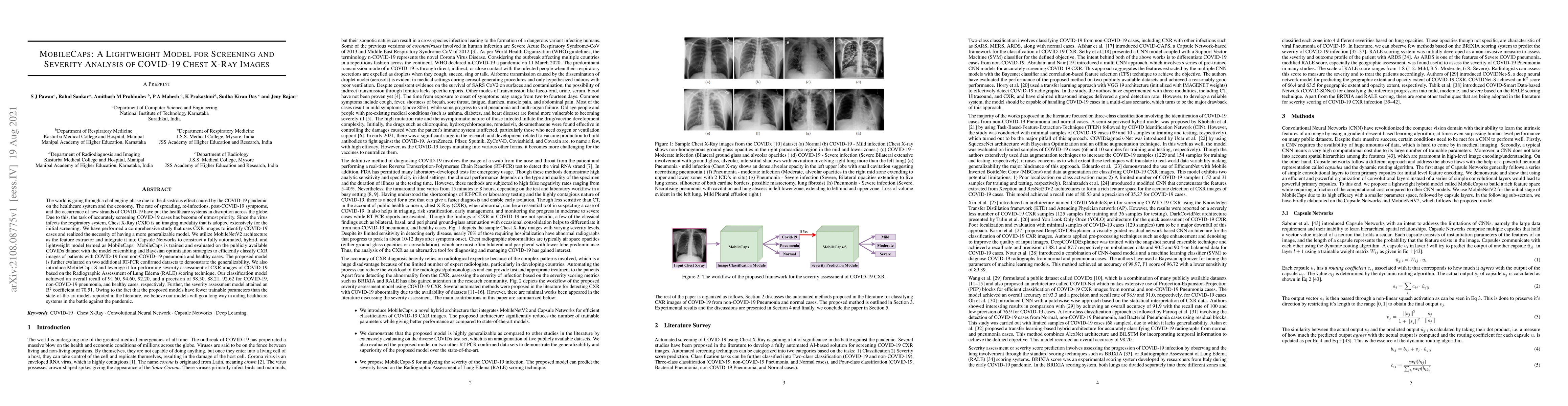 The world is going through a challenging phase due to the disastrous effect caused by the COVID-19 pandemic on the healthcare system and the economy. The rate of spreading, post-COVID-19 symptoms, and the occurrence of new strands of COVID-19 have put the healthcare systems in disruption across the globe. Due to this, the task of accurately screening COVID-19 cases has become of utmost priority. Since the virus infects the respiratory system, Chest X-Ray is an imaging modality that is adopted extensively for the initial screening. We have performed a comprehensive study that uses CXR images to identify COVID-19 cases and realized the necessity of having a more generalizable model. We utilize MobileNetV2 architecture as the feature extractor and integrate it into Capsule Networks to construct a fully automated and lightweight model termed as MobileCaps. MobileCaps is trained and evaluated on the publicly available dataset with the model ensembling and Bayesian optimization strategies to efficiently classify CXR images of patients with COVID-19 from non-COVID-19 pneumonia and healthy cases. The proposed model is further evaluated on two additional RT-PCR confirmed datasets to demonstrate the generalizability. We also introduce MobileCaps-S and leverage it for performing severity assessment of CXR images of COVID-19 based on the Radiographic Assessment of Lung Edema (RALE) scoring technique. Our classification model achieved an overall recall of 91.60, 94.60, 92.20, and a precision of 98.50, 88.21, 92.62 for COVID-19, non-COVID-19 pneumonia, and healthy cases, respectively. Further, the severity assessment model attained an R$^2$ coefficient of 70.51. Owing to the fact that the proposed models have fewer trainable parameters than the state-of-the-art models reported in the literature, we believe our models will go a long way in aiding healthcare systems in the battle against the pandemic.