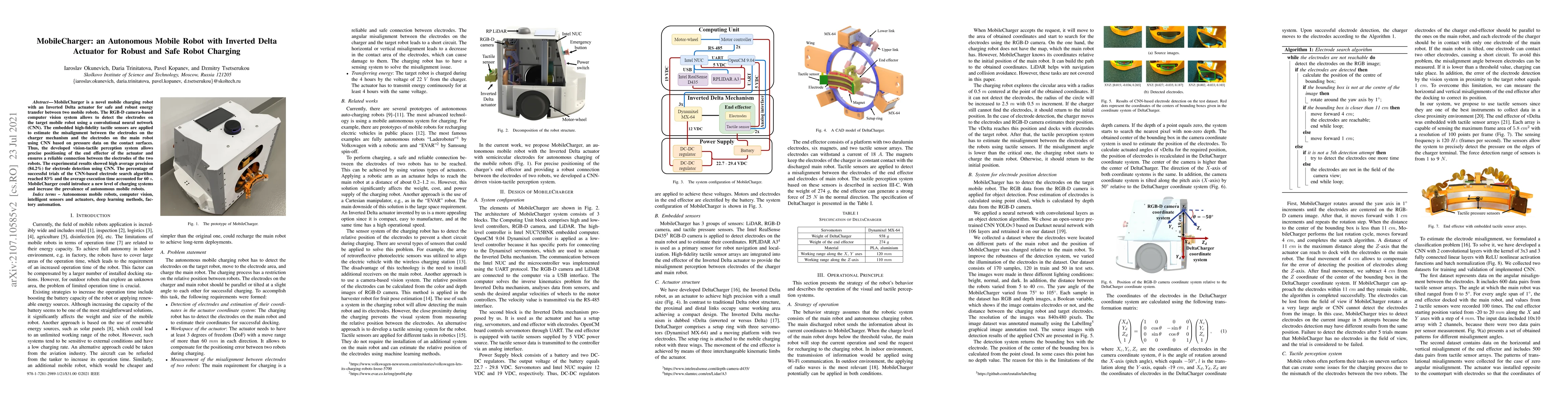 This research introduces MobileCharger, an autonomous mobile robot equipped with an Inverted Delta actuator for safe and robust charging of other mobile robots. It employs an RGB-D camera and CNN for precise electrode detection and a vision-tactile perception system to ensure reliable connections. The study demonstrates high precision and success rates in electrode detection and connection, suggesting potential advancements in autonomous mobile robot charging systems.