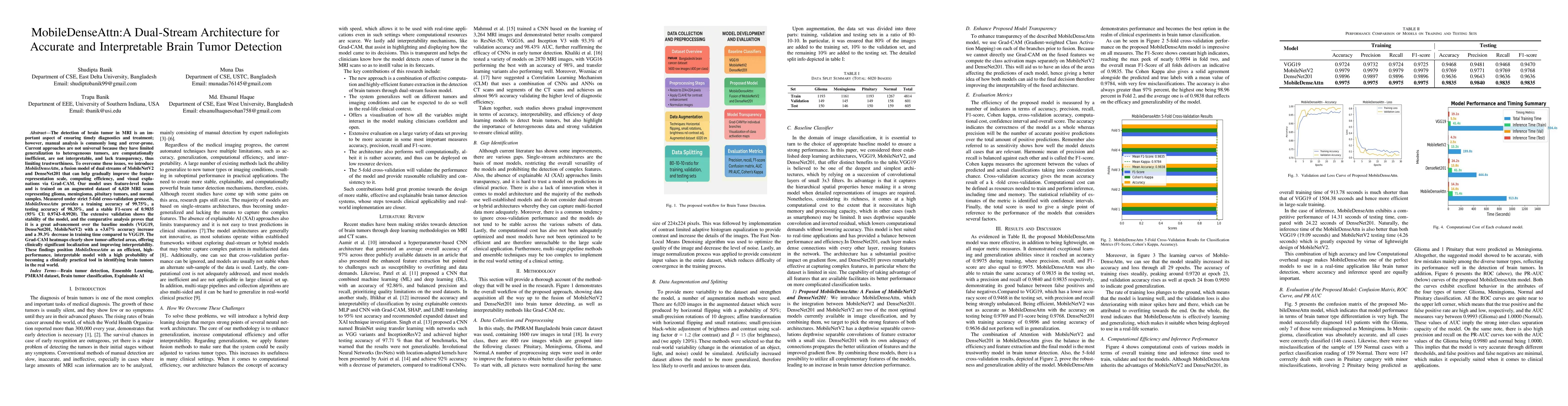 The detection of brain tumor in MRI is an important aspect of ensuring timely diagnostics and treatment; however, manual analysis is commonly long and error-prone. Current approaches are not universal because they have limited generalization to heterogeneous tumors, are computationally inefficient, are not interpretable, and lack transparency, thus limiting trustworthiness. To overcome these issues, we introduce MobileDenseAttn, a fusion model of dual streams of MobileNetV2 and DenseNet201 that can help gradually improve the feature representation scale, computing efficiency, and visual explanations via GradCAM. Our model uses feature level fusion and is trained on an augmented dataset of 6,020 MRI scans representing glioma, meningioma, pituitary tumors, and normal samples. Measured under strict 5-fold cross-validation protocols, MobileDenseAttn provides a training accuracy of 99.75%, a testing accuracy of 98.35%, and a stable F1 score of 0.9835 (95% CI: 0.9743 to 0.9920). The extensive validation shows the stability of the model, and the comparative analysis proves that it is a great advancement over the baseline models (VGG19, DenseNet201, MobileNetV2) with a +3.67% accuracy increase and a 39.3% decrease in training time compared to VGG19. The GradCAM heatmaps clearly show tumor-affected areas, offering clinically significant localization and improving interpretability. These findings position MobileDenseAttn as an efficient, high performance, interpretable model with a high probability of becoming a clinically practical tool in identifying brain tumors in the real world.