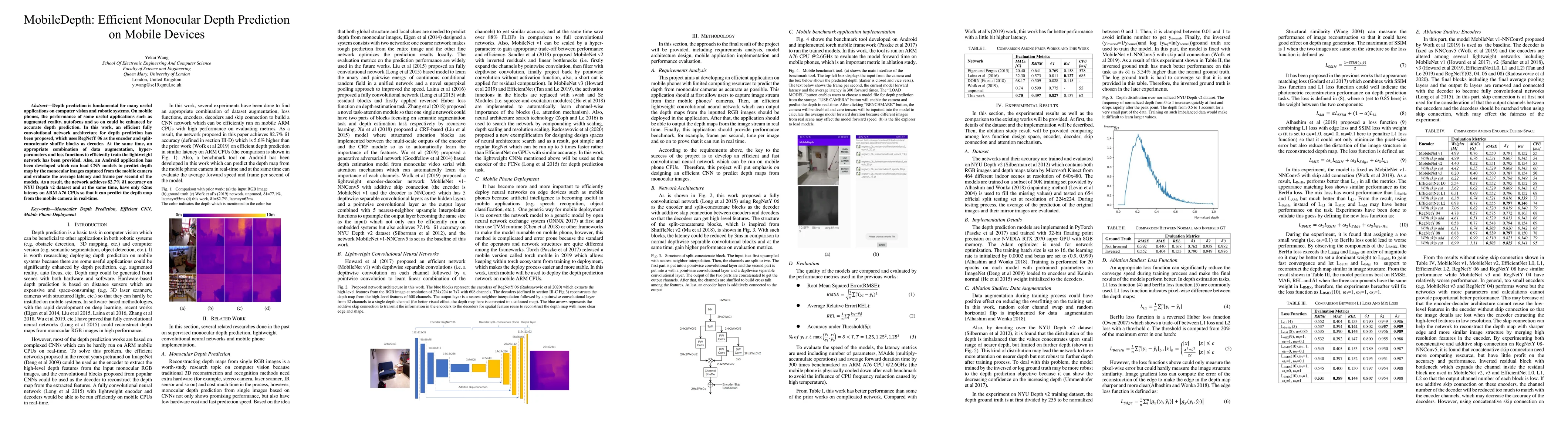 The paper proposes an efficient fully convolutional network for depth prediction using RegNetY 06 as the encoder and split-concatenate shuffle blocks as the decoder. It also details an appropriate combination of data augmentation, hyper-parameters, and loss functions for training the lightweight network. An Android application is developed to load CNN models for real-time depth prediction from mobile camera images.