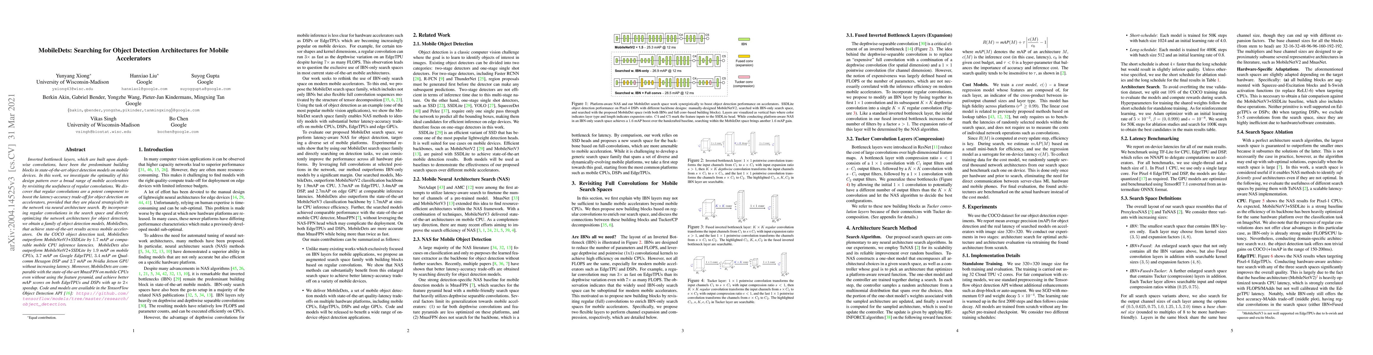 This paper explores the integration of regular convolutions into object detection architectures for mobile devices, finding they significantly enhance performance when strategically placed. The proposed MobileDets models, discovered via neural architecture search, outperform existing state-of-the-art models across various mobile accelerators without increasing latency.
