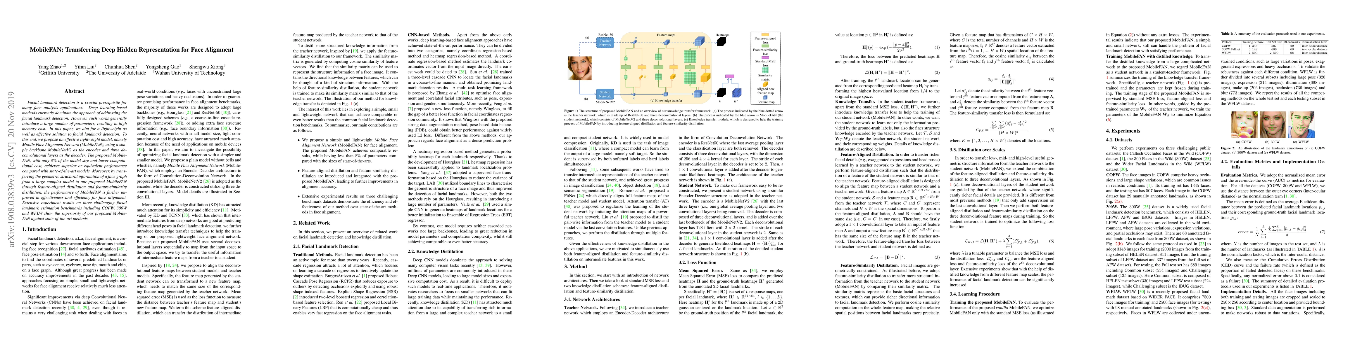 The paper proposes MobileFAN, a lightweight deep learning model for facial landmark detection using MobileNetV2 and deconvolutional layers, achieving high performance with lower memory and computational costs. The model's effectiveness is further enhanced through feature-aligned and feature-similarity distillation from larger complex models.