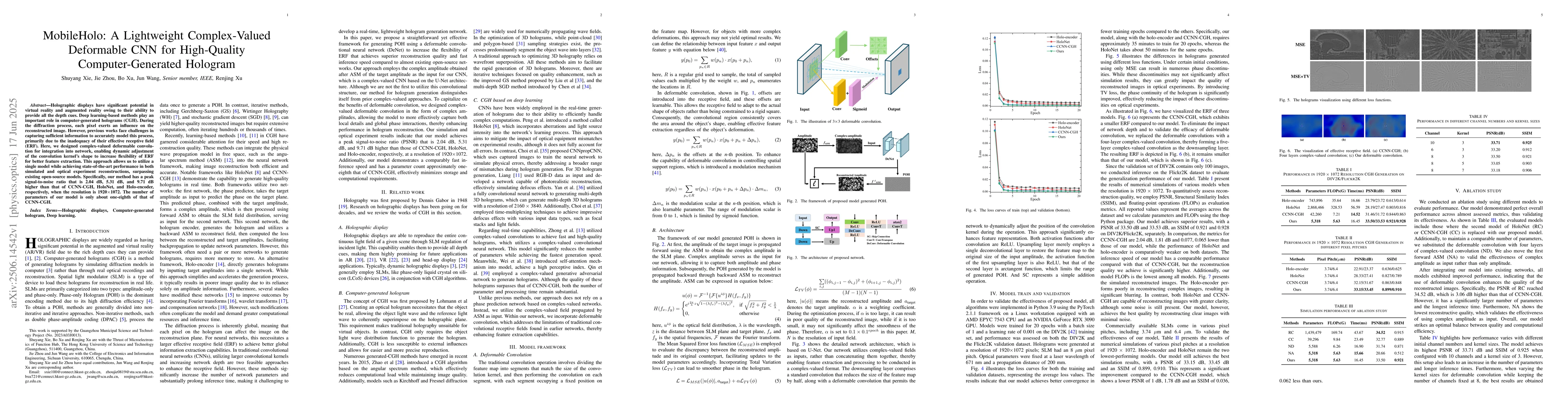 This research introduces MobileHolo, a lightweight complex-valued deformable Convolutional Neural Network (CNN) designed to enhance the quality of computer-generated holograms (CGH). By dynamically adjusting the convolution kernel's shape, MobileHolo increases the flexibility of the effective receptive field for better feature extraction. This method outperforms existing models, achieving higher peak signal-to-noise ratios and using significantly fewer parameters.