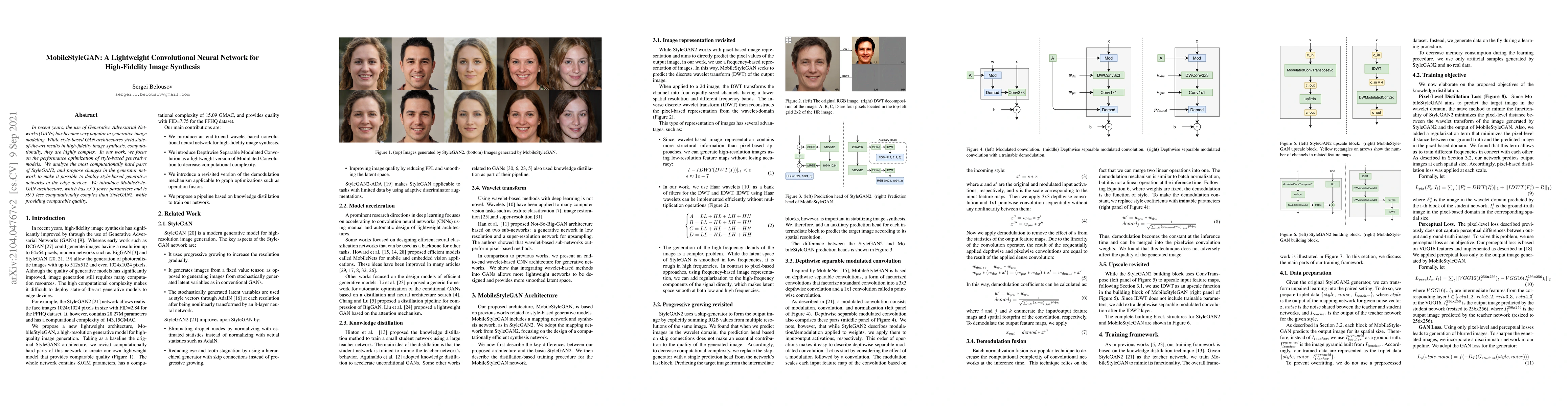 In recent years, the use of Generative Adversarial Networks (GANs) has become very popular in generative image modeling. While style-based GAN architectures yield state-of-the-art results in high-fidelity image synthesis, computationally, they are highly complex. In our work, we focus on the performance optimization of style-based generative models. We analyze the most computationally hard parts of StyleGAN2, and propose changes in the generator network to make it possible to deploy style-based generative networks in the edge devices. We introduce MobileStyleGAN architecture, which has x3.5 fewer parameters and is x9.5 less computationally complex than StyleGAN2, while providing comparable quality.