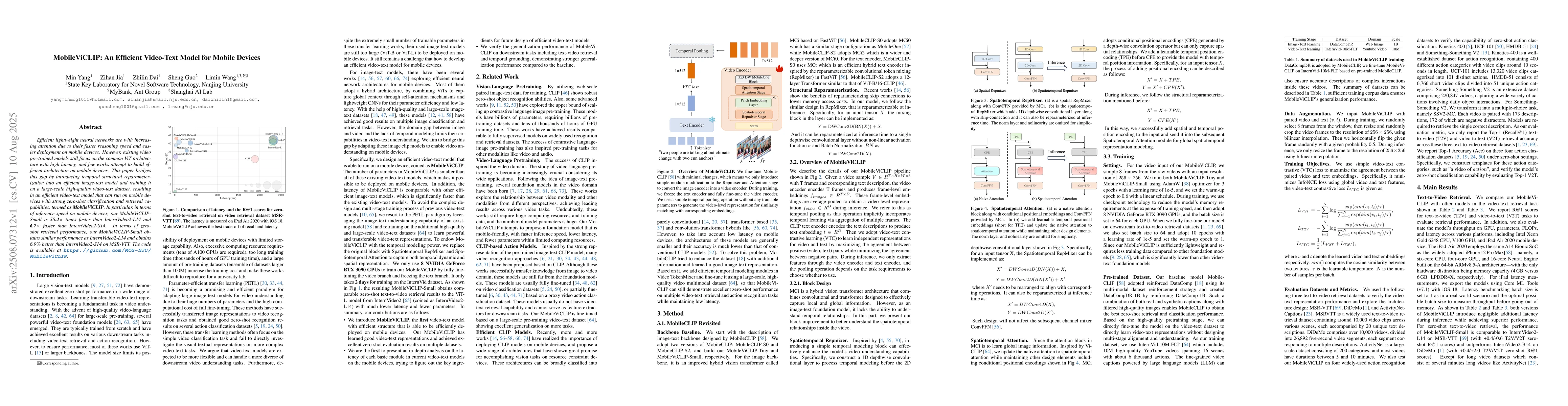 Efficient lightweight neural networks are with increasing attention due to their faster reasoning speed and easier deployment on mobile devices. However, existing video pre-trained models still focus on the common ViT architecture with high latency, and few works attempt to build efficient architecture on mobile devices. This paper bridges this gap by introducing temporal structural reparameterization into an efficient image-text model and training it on a large-scale high-quality video-text dataset, resulting in an efficient video-text model that can run on mobile devices with strong zero-shot classification and retrieval capabilities, termed as MobileViCLIP. In particular, in terms of inference speed on mobile devices, our MobileViCLIP-Small is 55.4x times faster than InternVideo2-L14 and 6.7x faster than InternVideo2-S14. In terms of zero-shot retrieval performance, our MobileViCLIP-Small obtains similar performance as InternVideo2-L14 and obtains 6.9\% better than InternVideo2-S14 on MSR-VTT. The code is available at https://github.com/MCG-NJU/MobileViCLIP.