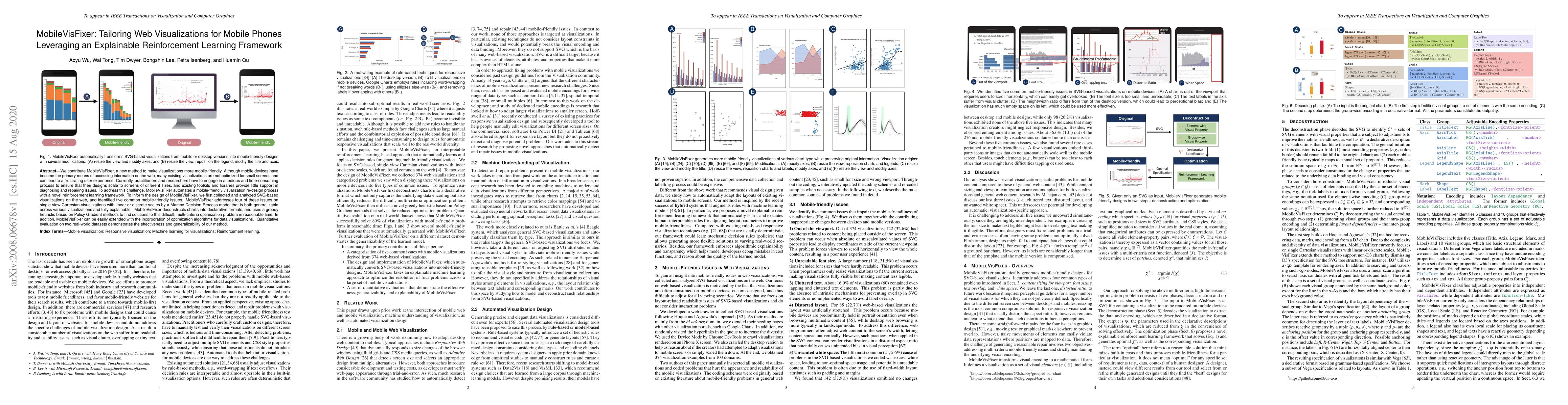 MobileVisFixer automates the redesign of web visualizations to be mobile-friendly using an explainable reinforcement learning framework, addressing common issues identified in SVG-based visualizations and demonstrating effectiveness through quantitative evaluation.